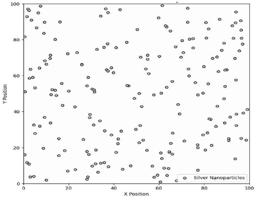 يوفر الشكل 3 توضيحًا نوعيًا للتوزيع المكاني لجزيئات الفضة النانوية، مع تسليط الضوء على انتشارها العام عبر منطقة معينة. يهدف هذا الشكل إلى إعطاء انطباع عام عن وضع الجسيمات وتجمعها