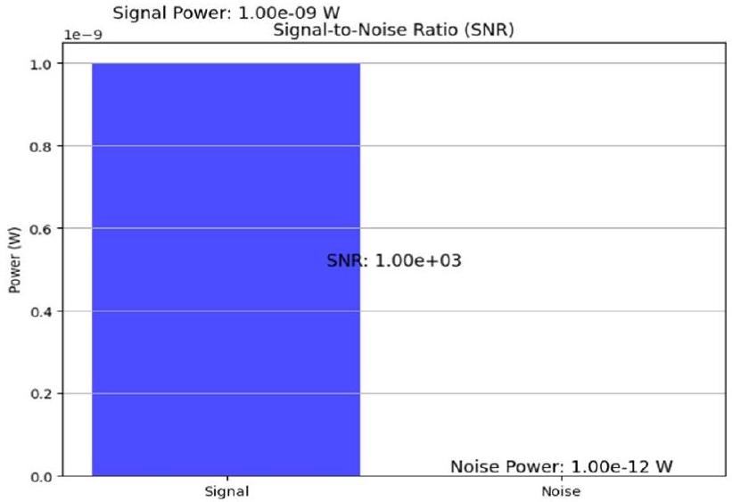 Assessing SNR validates sensor node efficacy in detecting biochemical signals amidst background noise. Figure 8 , contrasts signal and noise power levels, illustrating the sensor’s capability to differentiate signal integrity from environmental interference. This evaluation is pivotal for ensuring reliable and accurate data acquisition in diverse application scenarios, enhancing overall sensor performance and data quality. After deploying the nodes, the network must be configured and calibrated. This step involves setting up the communication protocols, ensuring that each node can effectively transmit data to its neighbours and the central hub. Calibration ensures that the sensors are accurately measuring the desired parameters, such as biochemical levels, temperature, or humidity. The calibration process might include adjusting sensor sensitivity and testing communication ranges to ensure optimal performance. This step is crucial for ensuring that the network operates efficiently and provides reliable data. With the network fully operational, data management and analysis become the focal points. Data collected by the sensor nodes are transmitted through the mesh network to a central hub or multiple hubs, where it is aggregated and processed. The robust nature of a mesh topology ensures that data from all nodes are reliably transmitted, even if some nodes fail [21]. Advanced data analytics can be applied to interpret the collected data, providing valuable insights