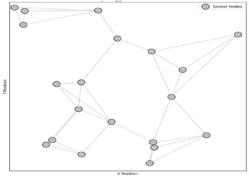 Figure 9 demonstrates a mesh topology for a wireless sensor network with sensor nodes embedded with noble metal nanostructures home area networking [22,23]. The graph shows 20 nodes distributed randomly across a defined area, each represented by a silver dot. Nodes are connected to their three nearest neighbours with grey lines, illustrating the mesh network’s structure [24]. This network configuration allows for robust data transmission, even if some nodes fail. The visualization helps to understand the strategic placement and interconnection of nodes to ensure effective coverage, reliable data acquisition, and resilient communication within the mesh topology.