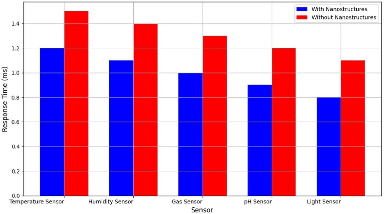 Figure 10 compares the response times of sensors with and without noble metal nanostructures across different sensor types: temperature, humidity, gas, pH, and light sensors. Response time, measured in milliseconds, indicates how quickly a sensor detects and responds to changes in its environment [30]. Figure 4 clearly illustrates that sensors [31] integrated with noble metal nanostructures generally exhibit lower response times compared to their counterparts without nanostructures [32, 33]. This significant reduction in response time is critical for applications requiring real-time monitoring and rapid detection of environmental changes. The enhanced responsiveness of nanostructure-integrated sensors can be attributed to their improved surface area-to-volume ratio and catalytic properties, which facilitate faster interaction