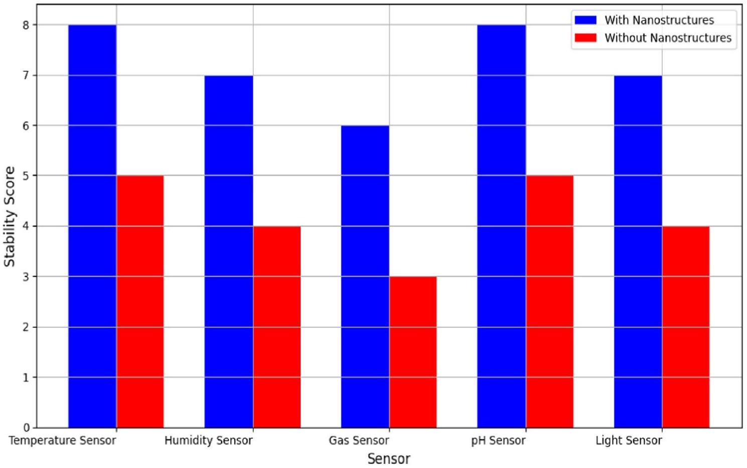 Figure 12 assesses the stability of sensors with and without noble metal nanostructures under harsh environmental conditions. Stability scores, depicted on a comparative scale, indicate the sensors’ ability to maintain performance integrity when exposed to environmental stressors like temperature fluctuations, humidity variations, and corrosive agents. Analysis of the stability scores demonstrates that sensors integrated with noble metal nanostructures consistently achieve higher stability ratings compared to those without nanostructures. This finding underscores the protective and stabilizing effect of nanostructured polymer matrices, which shield the sensors from environmental degradation and enhance their longevity. The graph visually supports the hypothesis that nanostructure integration enhances sensor robustness, making them resilient to challenging operating environments typical in WSN deployments. Therefore, the graph provides empirical evidence of the practical benefits of integrating noble metal nanostructures in polymer matrices for ensuring sensor reliability and longevity in diverse environmental conditions.