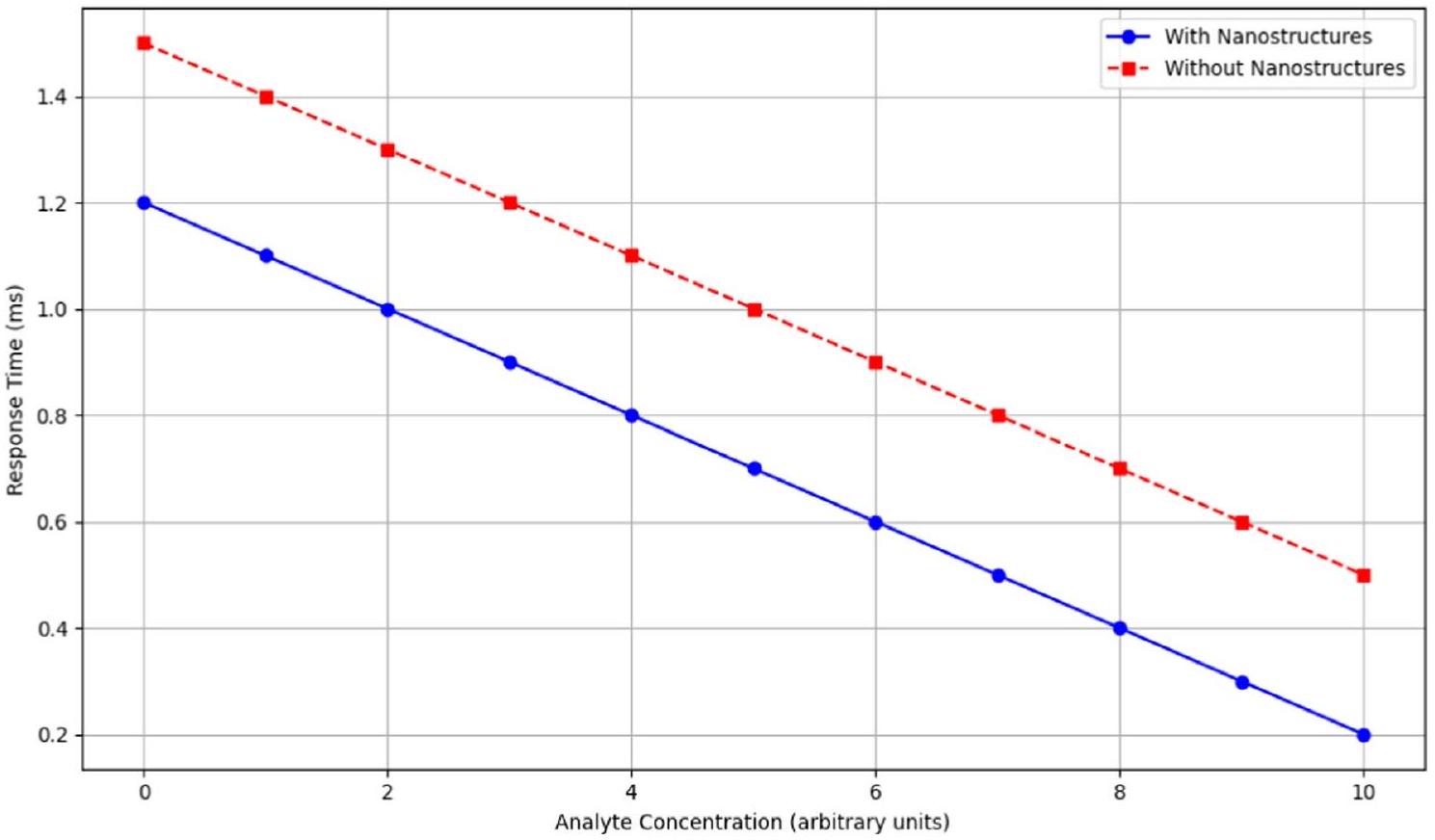 As demonstrated in Fig. 13, It is evident that sensors with noble metal nanostructures consistently exhibit faster response times across all analyte concentrations. As the analyte concentration increases, the response times for both sensor types decrease; however, the decrease is more pronounced in sensors with nanostructures. For instance, at an analyte concentration of 0 , the response time for nanostructured sensors is 1.2 ms , compared to 1.5 ms for nonnanostructured sensors. This trend continues, showing significantly lower response times for nanostructured sensors at higher analyte concentrations, such as 0.2 ms at a concentration of 10, compared to 0.5 ms for non-nanostructured sensors. The faster response times [39] imply potential long-term cost savings due to reduced maintenance and replacement needs, as these sensors may have greater durability and efficiency, justifying the higher initial costs of nanostructure integration. This characteristic is crucial for real-time monitoring applications, where rapid detection is vital. The enhanced performance of nanostructured sensors is likely due to the increased surface area and catalytic properties of