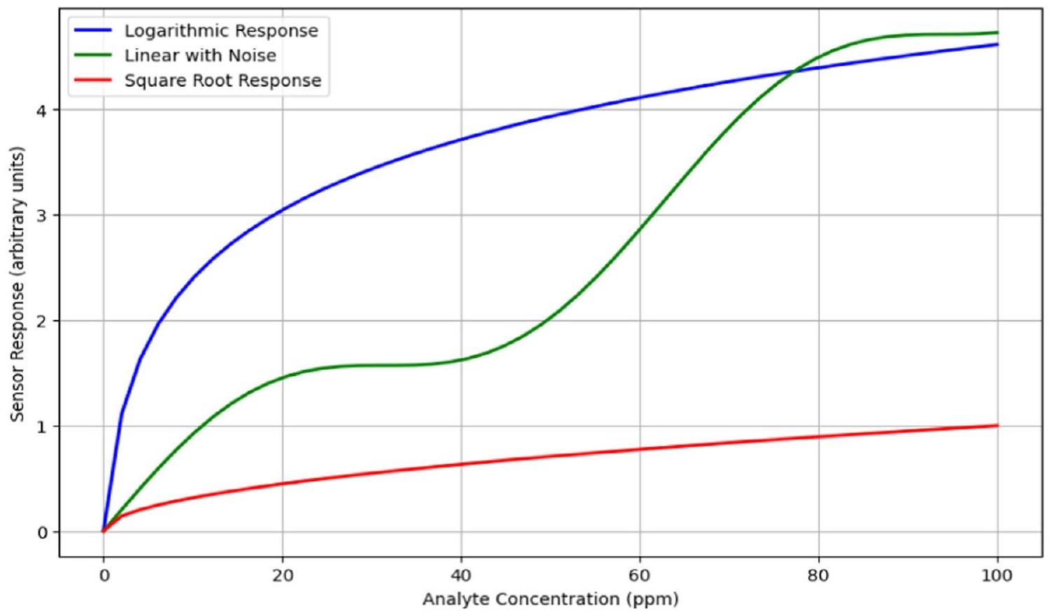 Figure 15 demonstrates the response curves of three distinct sensors to varying concentrations of an analyte, from 0 to 100 ppm , revealing their efficiency and effectiveness. The logarithmic response (blue line)sensor shows high sensitivity at