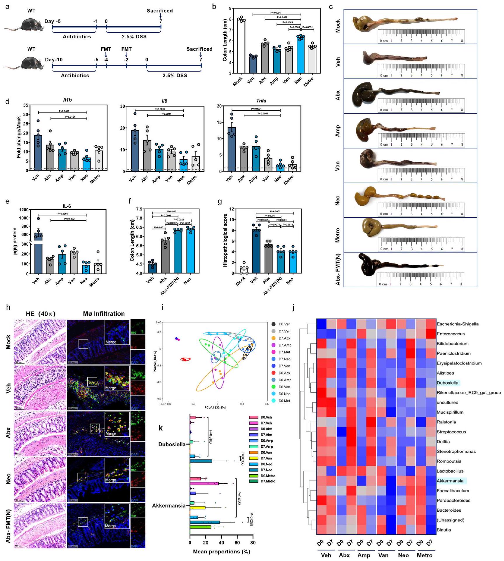 تم إعطاء فئران C57BL/6J من النوع البري (WT) الأمبيسيلين (Amp) والفانكومايسين (Van) والنيوميسين (Neo) أو المترونيدازول (Metro) إما بشكل فردي أو ككوكتيل يحتوي على الأربعة (Abx) عن طريق التغذية الفموية، ثم تعرضت لـ DSS (الشكل 1a). تم تأكيد اضطراب ميكروبيوم الأمعاء بواسطة كل من Abx وجميع علاجات المضادات الحيوية الأربعة الفردية كخفض كبير في نسخ 16 S rDNA (الشكل التوضيحي 1a). كان لعلاج Neo أفضل تأثير في تخفيف التهاب القولون الناتج عن DSS، حيث تمثل ذلك في أقل فقدان للوزن (الشكل التوضيحي 1b)، ووجود قولون أطول (الشكل 1b، c) بالإضافة إلى انخفاض مستويات mRNA في القولون للسيتوكينات المؤيدة للالتهابات (الشكل 1d) وبروتين IL-6 (الشكل 1e).