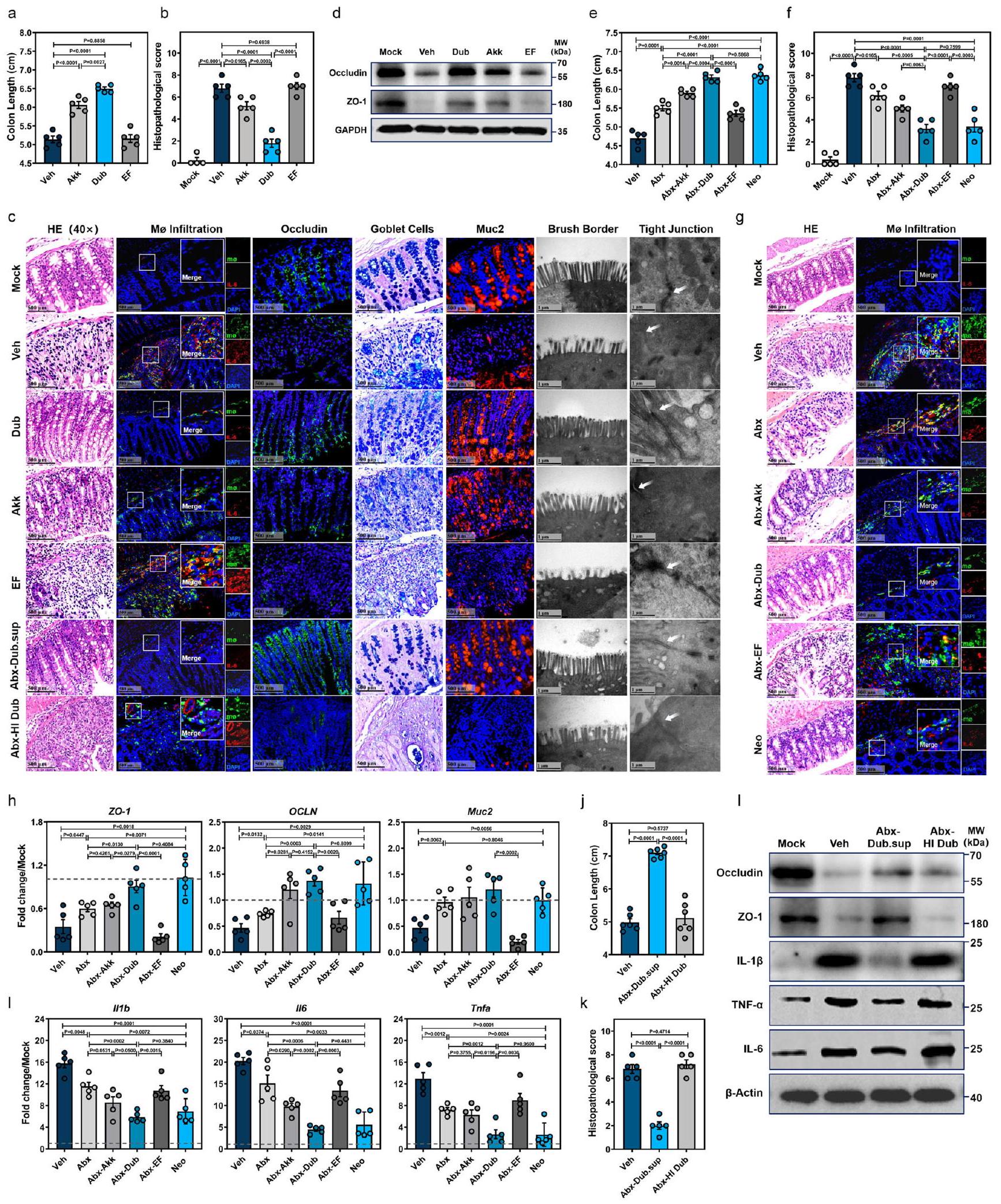 في هذه الأثناء، تعبير ZO-1 وOCLN وMuc2 في خلايا الظهارة المعوية القولونية المعزولة )، وتم الكشف عن تعبير السيتوكينات المؤيدة للالتهابات Illb و Il6 و Tnfa في الغشاء المخاطي القولوني (cLP) (i) بواسطة qRT-PCR.-فئران WT التقليدية (تم إعطاء Dub المعطل حرارياً (HI) أو السائل الفائق من Dub (Dub.sup) عن طريق الفم وتم تعريضهم لـ DSS. في اليوم السابع بعد إعطاء DSS، تم قياس طول القولون (j) وتم تسجيل التغيرات النسيجية المرضية بواسطة صبغة HE.مستوى بروتينات الوصل الضيق أوكلودين و ZO-1، وتعبير السيتوكينات المؤيدة للالتهابات IL-1IL-6 و TNF-تم تحديدها بواسطة WB (I). الخطوط المتقطعة عند 1 تشير إلى أن العلاجات لها قيمة متساوية كضوابط موحدة. النتائج تمثل بيانات تم توليدها في تجربتين مستقلتين على الأقل وتُعبر عنها كمتوسط.SEM، وذو جانبينتم فحص القيم بواسطة اختبار الطالب-اختبار. يتم توفير بيانات المصدر كملف بيانات المصدر. بالنسبة للمجموعات الضابطة، كان هناك زيادة ملحوظة في تعبير ZO-1 وOCLN وMuc2 في خلايا الظهارة المعوية (clECs) (الشكل 2h) وانخفاض كبير في Illb وIl6 وTnfa في الأنسجة المعوية (cLP) (الشكل 2i) مقارنة بمجموعات Abx-Akk وAbx-EF وAbx أو Veh.