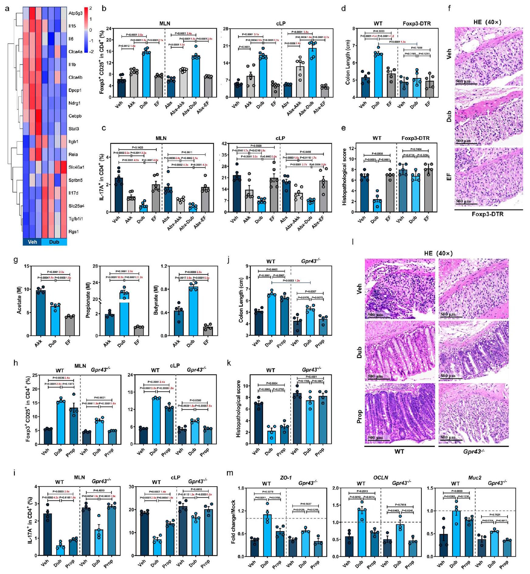 الشكل 3 | D. newyorkensis يمنع التهاب القولون الناتج عن DSS من خلال تنظيم فوكس بي 3تعمل خلايا Tregs جزئيًا من خلال محور الإشارة SCFA-GPR43. خريطة حرارية تظهر تعبير mRNA الذي تم تحديده بواسطة تسلسل RNA الكمي في عينات القولون من المعالجة بالسيارة (Veh) ( ) أو D. newyorkensis (Dub) – مستعمرات من فئران C57BL/6J البرية من النوع البري ( ) في D7 بعد علاج DSS. ب، ج CD25+Foxp3+Tregs (ب) و ILالخلايا (ج) في العقد اللمفاوية المساريقية (MLN) والطبقة الغشائية القولونية (cLP) للفئران البرية التقليدية أو المعالجة بالمضادات الحيوية التي استعمرت بـ Dub أو A. muciniphila (Akk) أو E. faecalis (EF)تم فحصها بواسطة تحليل تدفق الخلايا في اليوم السابع بعد علاج DSS. د-ف الفئران التقليدية WT أو Foxp3-DTR ( ) تم استعمارها بـ تمت معالجة CFU من Dub أو Akk أو EF بعلاج DSS. في اليوم السابع بعد إدارة DSS، تم قياس طول القولون (د) وإجراء التقييم النسيجي (هـ، و). ج تم تحديد تركيز SCFA في السوبرناتانت الثقافي لـ Dub أو Akk أو EF بواسطة GC/MS.. فئران WT التقليدية و Gpr43-/- ) كانوا