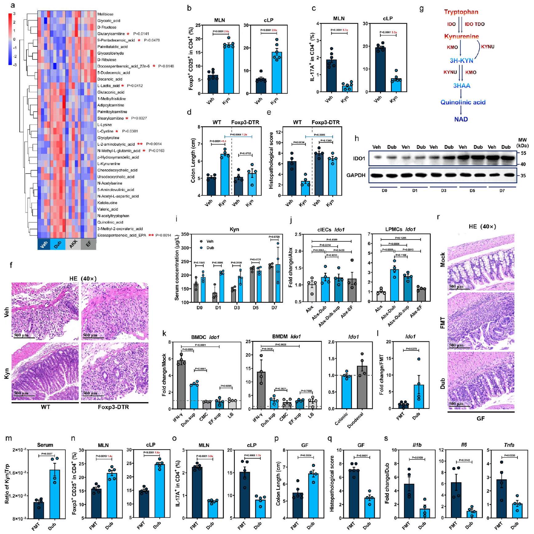 الشكل 4 | D. نيويوركنسيس يعزز CD25فوكس بي 3تريغس من خلال تعزيز استقلاب التربتوفان بواسطة IDO1 في الخلايا التغصنية. خريطة حرارية تظهر المستقلبات المختلفة في القولون في اليوم السابع بعد علاج DSS من فئران C57BL/6J البرية (WT) المعالجة بالسيارة (Veh، ) أو مستعمرة مع D. newyorkensis (Dub) أو A. muciniphila (Akk) أو E. faecalis (EF) ( ). تمثل التعليقات الإحصائية المقابلة للمواد الأيضية المختلفة الفروق بين الفئران المستعمرة بدوب وغير المستعمرة. ب، ج مجموعات خلايا T في العقد اللمفاوية المساريقية (MLN) والطبقة الظهارية القولونية (cLP) من المعالجة بـ Veh أو Kyn ( تم فحص فئران WT التقليدية بواسطة التدفق. فئران Foxp3-DTR المعالجة بـ WT أو DTتم علاجهم بـ Kyn وتعرضوا لإدارة DSS لمدة 7 أيام، وتم فحص طول القولون (د) وعلم الأمراض النسيجي (هـ، و). ج رسم تخطيطي لمسار تحلل Kyn في استقلاب التربتوفان. ح، ط حركية تعبير IDO1 في القولون (ح) وتركيز Kyn في المصل (ط) في الفئران التقليدية WT المستعمرة بـ Dub أو Veh. ) في الأوقات المحددة بعد إدارة DSS. تعبير IDO1 في خلايا الظهارة المعوية القولونية (cIECs) أو خلايا أحادية النواة في الطبقة الأساسية (cLPMCs) المستخرجة