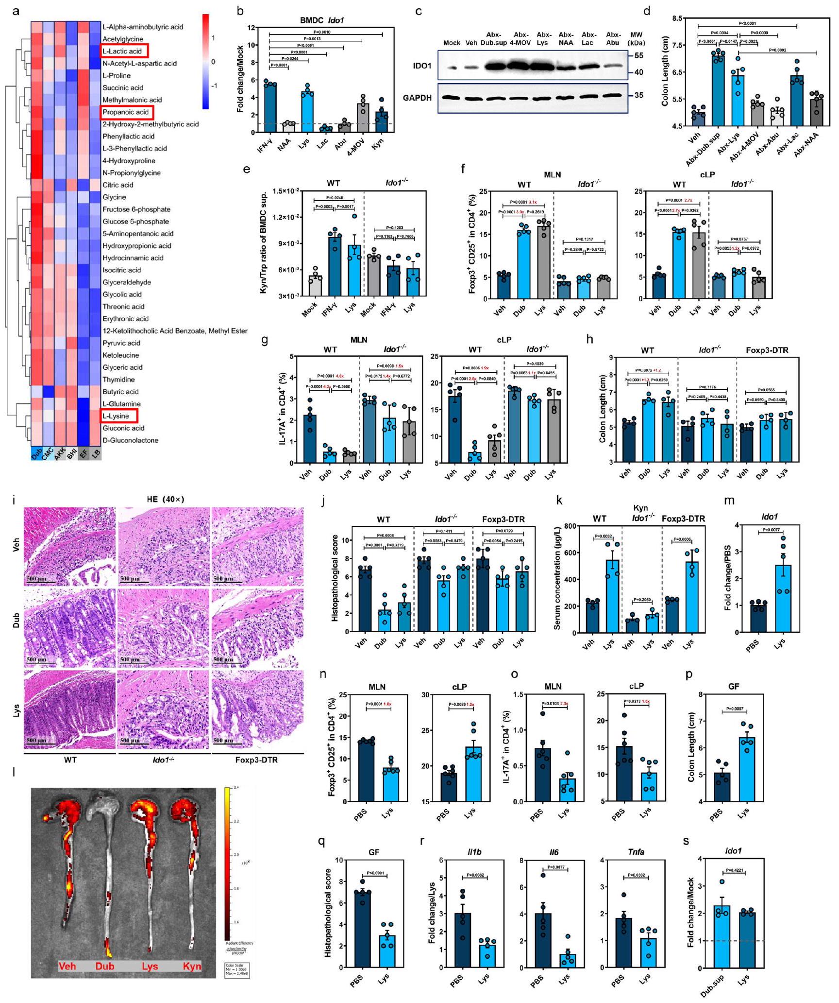 لاختبار الأهمية الفسيولوجية لتعزيز IDO1 الذي يتم بوساطة Lys في قمع الالتهاب من خلال تحفيز Treg في الجسم الحي، قمنا بإعطاء فئران WT التقليدية، Ido1-/- أو Foxp3-DTR Dub أو Lys قبل التعرض لـ DSS (الشكل التوضيحي التكميلي 8j). وُجد أن علاج Lys زاد منفوكس بي 3تريغس وانخفاضخلايا T إلى حد مشابه لما فعلته استعمار دوب في الطحال، والعقد اللمفية المتوسطة، والقولون السفلي مقارنة بالفئران WT المعالجة بـ Veh، لكن Lys فشل في التعديلفوكس بي 3تريغس في جميع الأنسجة الثلاثة أوالخلايا في cLP من Ido1الفئران (الشكل 5f و g والشكل التوضيحي 8k).