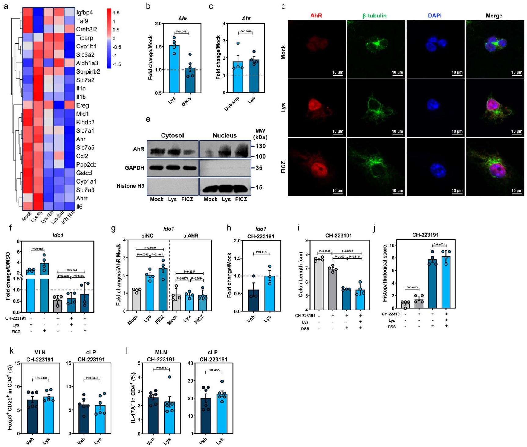 فيما سبق، تم استخدام ما يلي: ليسين (8 مللي مول)، FICZ (300 نانومول)، و CH-223191 ( ). للتجارب الموضحة في ( ) أدناه، فئران WT التقليدية ( ) تم علاجها بـ Lys ( )، CH-223191 ( )، أو ليس مع CH-223191 وتعرض لإدارة DSS.تعبير Ido1 في cLPMCs من الفئران WT المعالجة بـ Veh أو Lys في اليوم الثالث بعد إعطاء DSS في وجود CH-223191طول القولون (i)، التغيرات النسيجية المرضية بواسطة صبغة HECD25فوكس بي 3تريغس ) و IL-17 CD4خلايا T ) ( تم فحص (MLN و cLP من الفئران التقليدية WT المعالجة بـ Veh أو Lys في وجود CH-223191 في اليوم السابع بعد علاج DSS. تشير الخطوط المتقطعة عند 1 إلى أن العلاجات لها قيمة متساوية كضوابط موحدة. النتائج تمثل بيانات تم توليدها في ثلاث تجارب مستقلة وتعبر عنها كمتوسط.SEM، وثنائي الجانب-تم فحص القيم بواسطة اختبار الطالب-اختبار. يتم توفير بيانات المصدر كملف بيانات المصدر. كما أن لها تأثيرًا معززًا على استقلاب التريبتوفان من خلال مسار الكينورينين عن طريق تعزيز تعبير IDO1 في كل من خلايا المناعة البشرية والفأرية عبر تنشيط AhR.