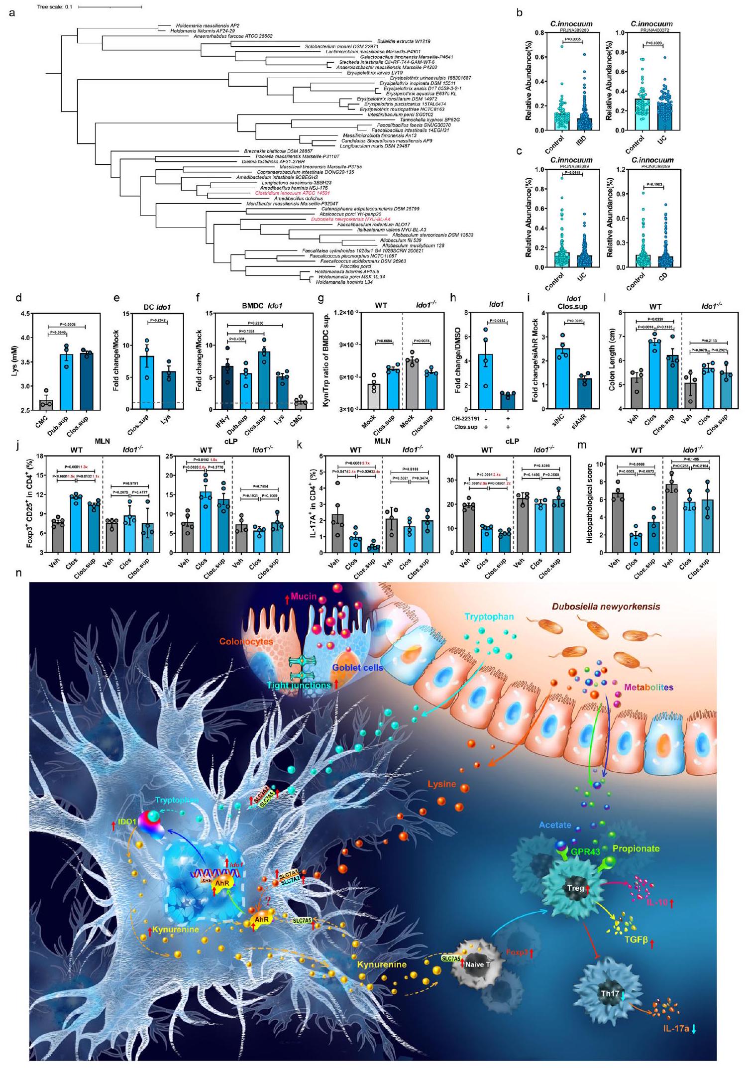 Fig. 7 | The human homolog of D. newyorkensis, Clostridium innocuum, generates L-Lys and protects against DSS-induced colitis by activating IDO1 expression in DCs. a Phylogenic analysis of the Erysipelotrichaceae family and the Clostridium innocuum isolate. b, c Relative abundance of C. innocuum (Clos) in fecal samples from healthy individuals and patients with inflammatory bowel disease (IBD) (b), and specifically ulcerative colitis (UC) and Crohn’s disease (CD) (c). Cohort PRJNA389280 (healthy, ; IBD, ), cohort PRJNA400072 (healthy, ; IBD, ), cohort PRJNA398089 (healthy, ; UC, ; CD, ). d Levels of Lys in the culture supernatants of Dub (Dub.sup) or Clos (Clos.sup) ( ). e qPCR of Ido1 mRNA in the Lys- or Clos.sup-treated human DCs extracted from peripheral blood mononuclear cells at 18 h post-treatment ( ). qPCR of Ido1 mRNA at 18 h post-treatment in wild-type C57BL/6J mouse (WT) bone marrowderived dendritic cells (BMDCs) treated with 8 mM Lys, IFN , Dub.sup, Clos.sup or chopped meat carbohydrate broth (CMC) ( ). g Kyn/Trp ratio of Clos.sup-treated, or nontreated BMDCs extracted from WT or Ido1-/- mice at 18 h post-treatment . h Expression of Ido1 in mouse BMDCs treated with Clos.sup,