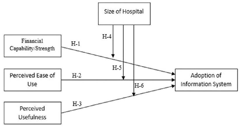 تدريب الموظفين، وتوظيف متخصصي تكنولوجيا المعلومات. لذلك، مقارنةً بالمستشفيات ذات الموارد المالية المنخفضة، فإن تلك التي تتمتع بوضع مالي أفضل تكون أكثر عرضة لاعتماد وتنفيذ نظام المعلومات الصحية بنجاح. العلاقة بين الوضع المالي، وفائدة الاستخدام المدركة، وسهولة الاستخدام المدركة، واعتماد نظام المعلومات الصحية تتأثر بحجم المستشفى. عادةً ما تكون المستشفيات الكبيرة لديها المزيد من الموارد المالية لوضع أنظمة معلومات معقدة واعتماد أنظمة معلومات صحية جديدة. بالإضافة إلى ذلك، قد يكون لديها المزيد من الموظفين والأقسام التي تستخدم النظام، مما يزيد من فائدته المدركة. من ناحية أخرى، قد تجد المستشفيات الصغيرة أنه من الصعب اعتماد نظام المعلومات الصحية، على الرغم من سهولة الاستخدام المدركة وفائدته. تميل هذه المستشفيات أيضًا إلى أن يكون لديها عدد أقل من الموظفين والموارد المالية.