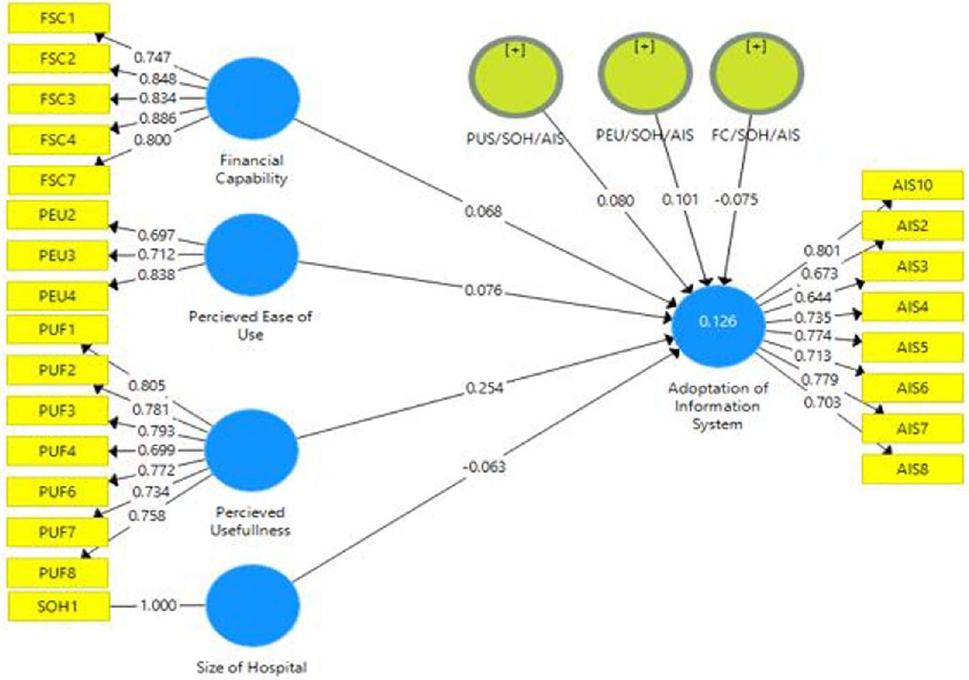 sensitive nature of data, which need the adoption of useful and user-friendly technologies (Huarng et al. 2022). Similarly, financial capability (Endriyas et al. 2023) of a healthcare organization is also critical as the adoption of HIS requires large investments in technological facilities, training, and maintenance. Hospitals might face difficulties in the adoption and integration of HIS if they have financial difficulties. This could impede their capacity to fully utilize HIS for better services. Therefore, consideration of PEU, PU and financial capability are essential determinants for HIS adopting strategies. In addition, the research also investigated the moderating influence of hospital size (Kraus et al. 2021) on the impact of PU, PEU and financial capability on the adoption of HIS. It is clear from the findings that hospital size has a moderating role on the impact of PEU on HIS adoption. In other words, the role of PEU on HIS adoption is dependent on the hospital size. PEU may impact the adoption of HIS in large hospitals more than in smaller hospitals, as large hospitals have more organizational resources and complexities than the smaller ones. Due to the importance of this moderating effect, PEU-enhancing measures must to be adapted according to the specific needs associated with hospital sizes. It is essential to understand the relationship between hospital size and PEU in influencing the adoption of HIS in order to establish tailored strategies and measures according to the various needs and difficulties, faced by different size healthcare organizations. As shown by the findings, there exists no significant moderating role of the hospital size on the relationship between financial capability, PU and the adoption of HIS. The influence of financial capability and PU on HIS adoption is similar in hospitals of various sizes. In other words, PU and funding capacity have a considerable impact on the decision to adopt HIS, regardless of the hospital’s size. The absence of this moderating impact suggests that tactics to increase PU and provide funding for the adoption of HIS should be widely used in all hospital of all size. It emphasizes the significance of these elements as broadly applicable drivers for the HIS adoption across all hospitals. The research has the following implications.