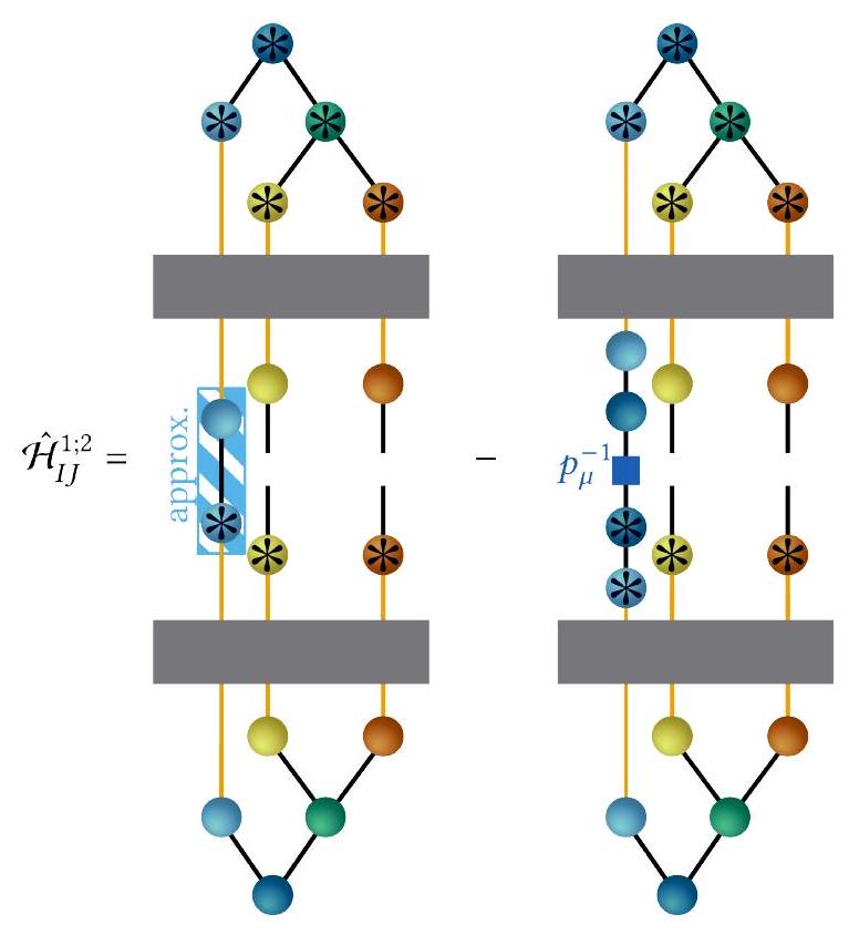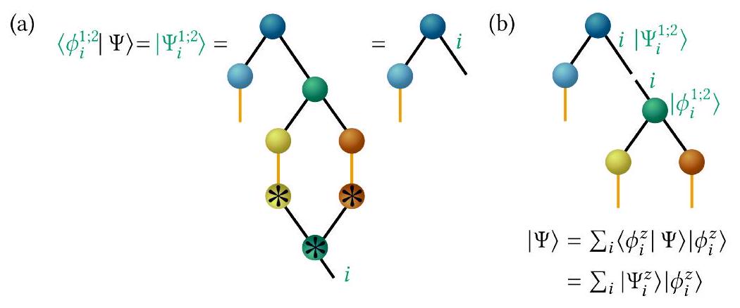 In special cases such as natural SHFs, virtual downward pointing bonds can be orthogonal but not orthonormal, see Section V. Note that we treat as independent of . As technical remark, care must be taken for tensors placed at tree branches to propagate them only once. These tensors need to be skipped during parts of the sweep so that they are only propagated once in one sweep. See Refs. [116, 151-153] for more details. One could avoid explicit inversion and solve a linear system instead. This is numerically more stable but does not alleviate the singularity problem, however.
