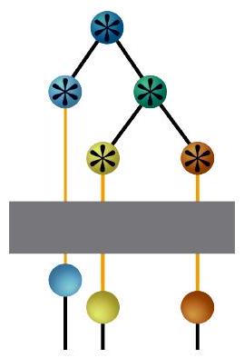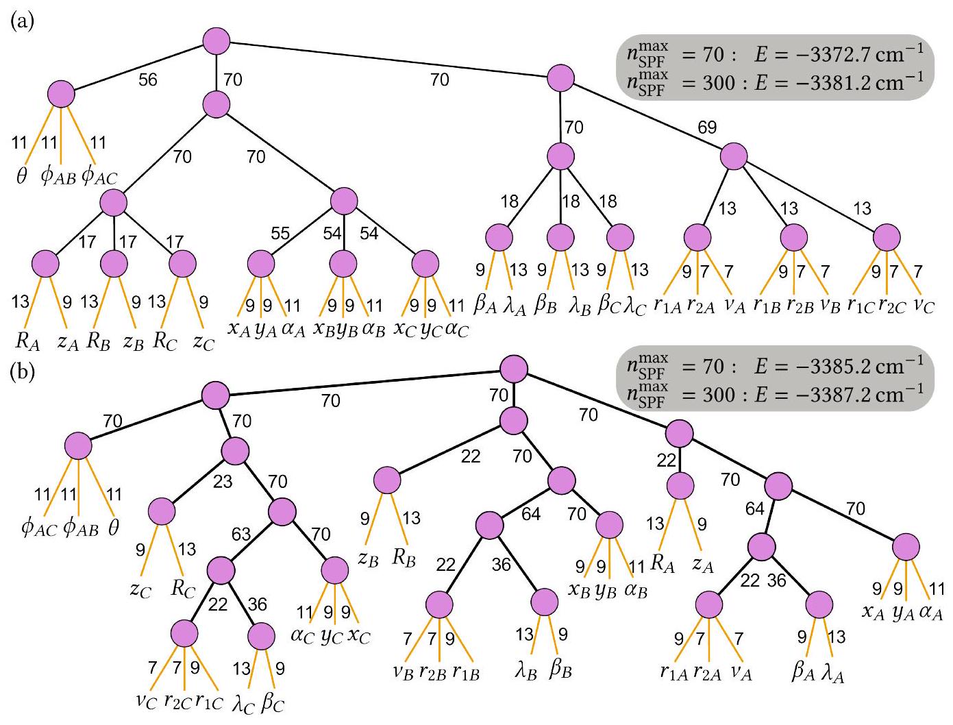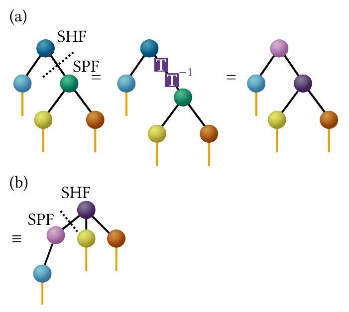 يمكن اختيار T لتعامد وتطبيع SHFs. وهذا يؤدي بعد ذلك إلى SPFs غير المتعامدة التي تم تحويلها بواسطة T. ومع ذلك، نظرًا لأن SPFs يجب أن تكون متعامدة وطبيعية، يمكننا الآن إعادة تفسير المعادلة (34) ببساطة من خلال تبادل معاني SHFs وSPFs المحولة بواسطة T عن طريق تحويل SHFs المتعامدة الآن إلى SPFs والعكس بالعكس. وهذا يؤدي إلى تغيير في هيكل الشجرة. بالإضافة إلى ذلك، إذا تم إجراء التحويل للطبقة الأولى، فإن عقدة الجذر تتغير. وهذا موضح في الشكل 25(b).