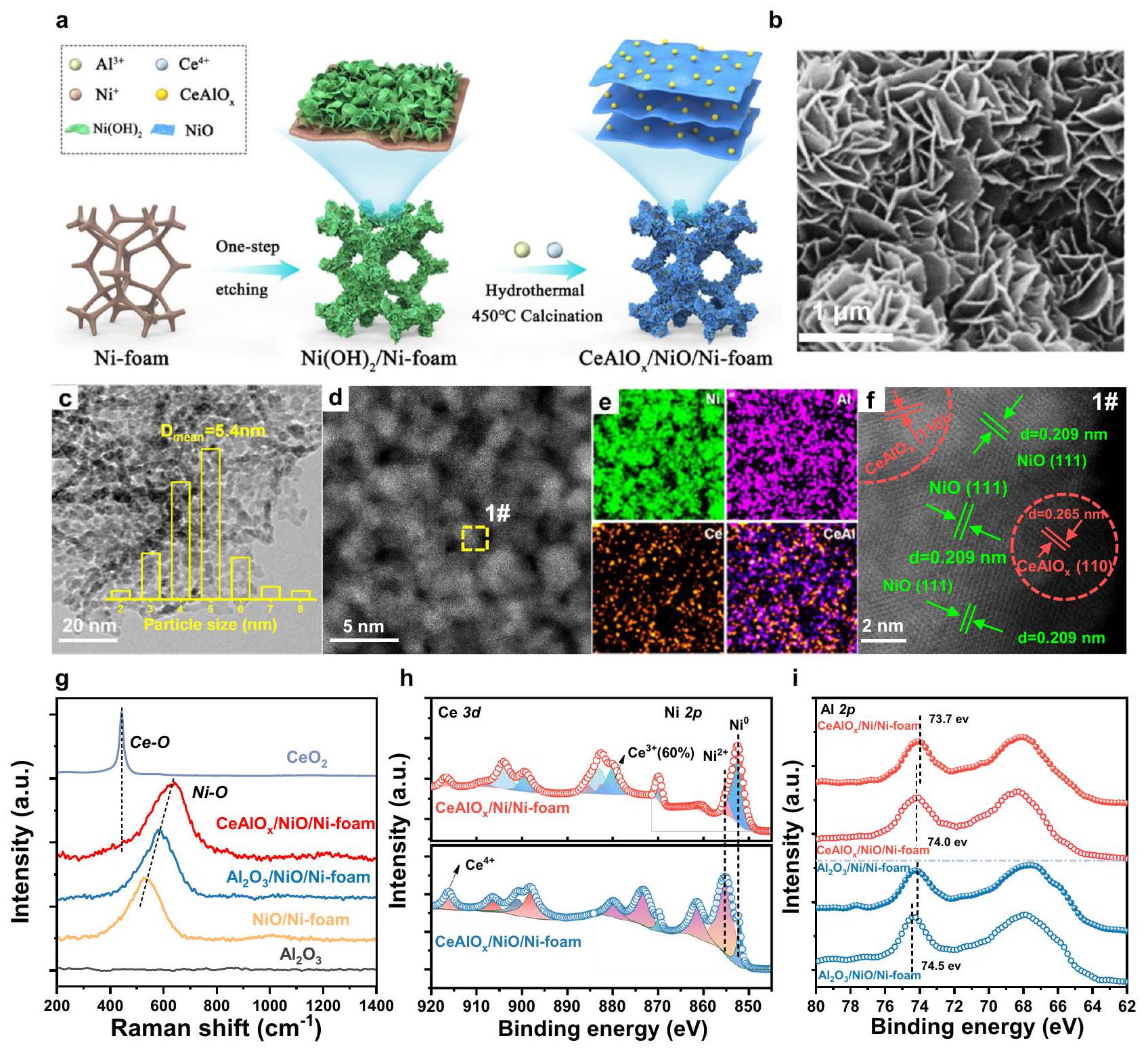 علم الشكل والميكروهيكل-الرغوة يتم ملاحظتها بشكل أكبر باستخدام طرق المجهر الإلكتروني. صور المجهر الإلكتروني الماسح (SEM) لـ-الرغوة تحافظ على هندسة الكتلة الصلبة وبنية المسام ثلاثية الأبعاد المتصلة بشكل غني بعد التعديل والمعالجات الحرارية (الشكل التكميلي 3).يعرض المركب مظهرًا يشبه رقائق العسل على هيكل رغوة النيكل بسمك متوسط (الشكل 1ب والشكل التكميلي 3). الالتصاق بـعلى رغوة النيكل قوية بما يكفي لتحمل المعالجة فوق الصوتية القوية (الشكل التكميلي 5)، مما يبرز فعالية طبقة النيكل أكسيد في تثبيت الأنواع الدقيقة من الأكسيد. صور المجهر الإلكتروني الناقل (TEM) لـعينة مأخوذة من المحفزات المنظمة تشير إلى أن جزيئات نانو NiO (التوزيع مركز عند ) يتم ترسيبها على السطح الخارجي لرغوة النيكل (الشكل 1c والشكل التكميلي 4). تؤكد صور مجهر الإلكترون الناقل المظلم بزاوية عالية (HAADF-STEM) وصور رسم خرائط العناصر باستخدام الأشعة السينية المشتتة للطاقة (EDS) التوزيع المتجانس لـ Ce و Al على جزيئات NiO في النانو-كومبوزيت (الشكل 1d، e). صورة على المستوى الذري للمنطقة من الشكل 1d يظهر الحواف الشبكية بمقدار 0.265 نانومتر (تتوافق مع، الشكل التوضيحي الإضافي 6)، مما يوضح تشكيلأكسيد مختلط ومحمّل على دعم NiO (الشكل 1f). بعد الاختزال، تم تشكيل واجهة عكسية تتكون منستتكون جزيئات أكسيد على دعم النيكل. يتم إجراء مطيافية رامان للتحقيق في اهتزاز المعدن-O لمختلف المحفزات ذات الهيكل الرغوي من النيكل (الشكل 1g). القمة عنديؤكد على مساهمةاستنادًا إلى مقارنة المعالجة السلبيةرغوة ومخفضة-محفز الرغوة، كـتختفي قمة الاهتزاز تمامًا (الشكل التوضيحي 7) بسبب الاختزال الكامل لـ NiO إلى المعدن.الانزياح نحو الأحمر لـقمم الاهتزاز في-رغوة ( ) يقارن بـ – رغوة ( )، وهو على الأرجح تأثير تكوين تنسيق Al-O-Ni. ثم، انزياح أحمر أكبر لـ تظهر الاهتزازات عند إدخال Ce إلى-محفز عكسي رغوي، ولم يظهر أي اهتزاز لـ Ce O، مما يشير إلى تكوينأكسيد مختلط يؤثر علىاهتزاز.