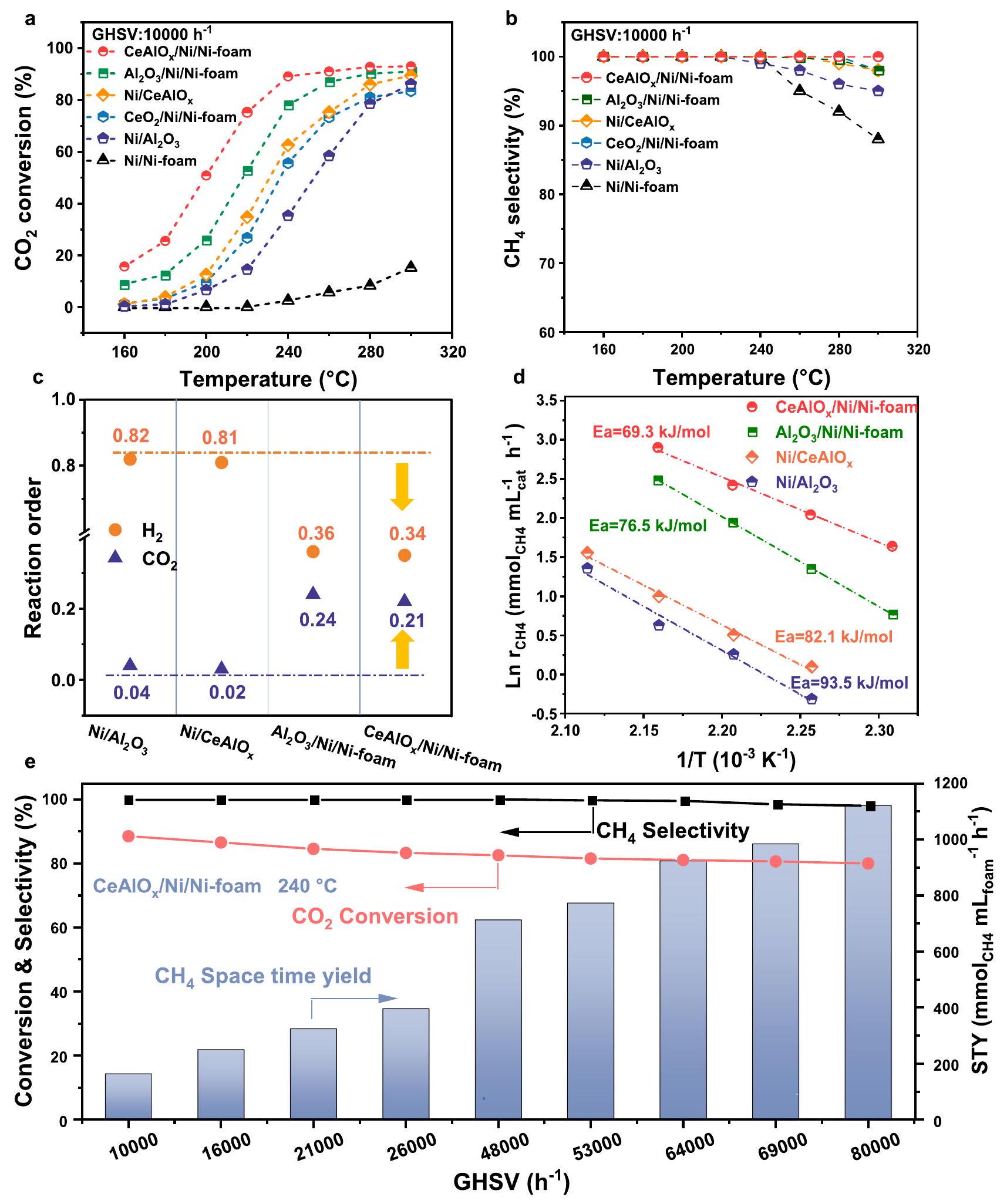 orders with respect to and for methane formation; based apparent activation energy of -foam, -foam, and catalysts; e GHSV-dependent activities of -foam catalyst at .