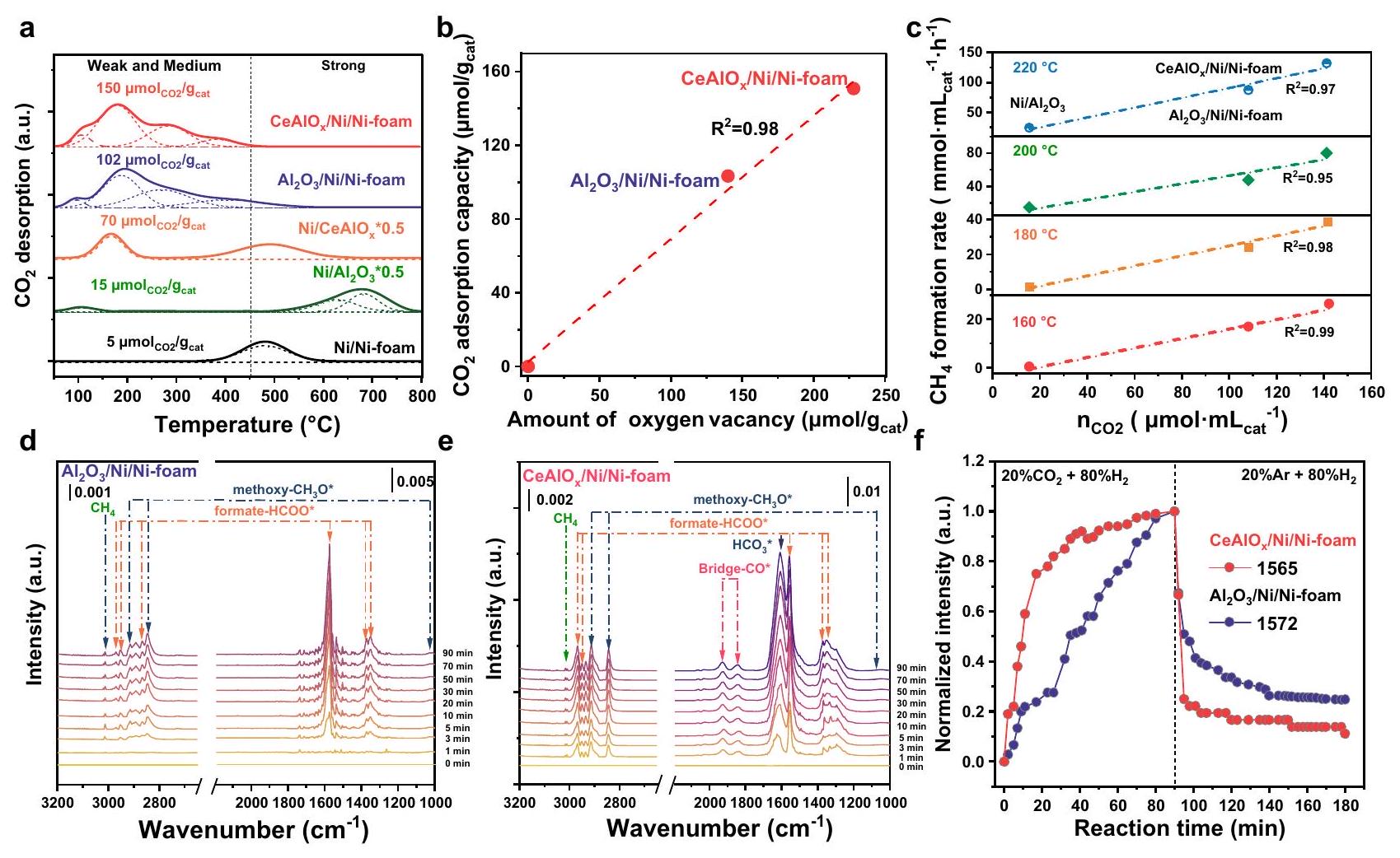 To understand the excellent catalytic performance of the -foam structured catalyst, a number of characterizations are performed to identify the active sites. temperature program desorption profiles (Fig. 3a) show the amount of adsorbed at weak and medium alkaline sites are 150 and (Supplementary Table 3). It can be seen that the capacity of weak- and mediumadsorbed display a near linear correlation with the density of oxygen vacancies ( ) (Fig. 3b). As the weak- and mediumadsorbed are determined to show a linear relationship with the intrinsic productivity of at , and (Fig. 3c), it can be confirmed that the oxygen vacancies at the inverse oxide-metal interface are probably the sites for activation at low temperature, which accounts for the activity of methanation.