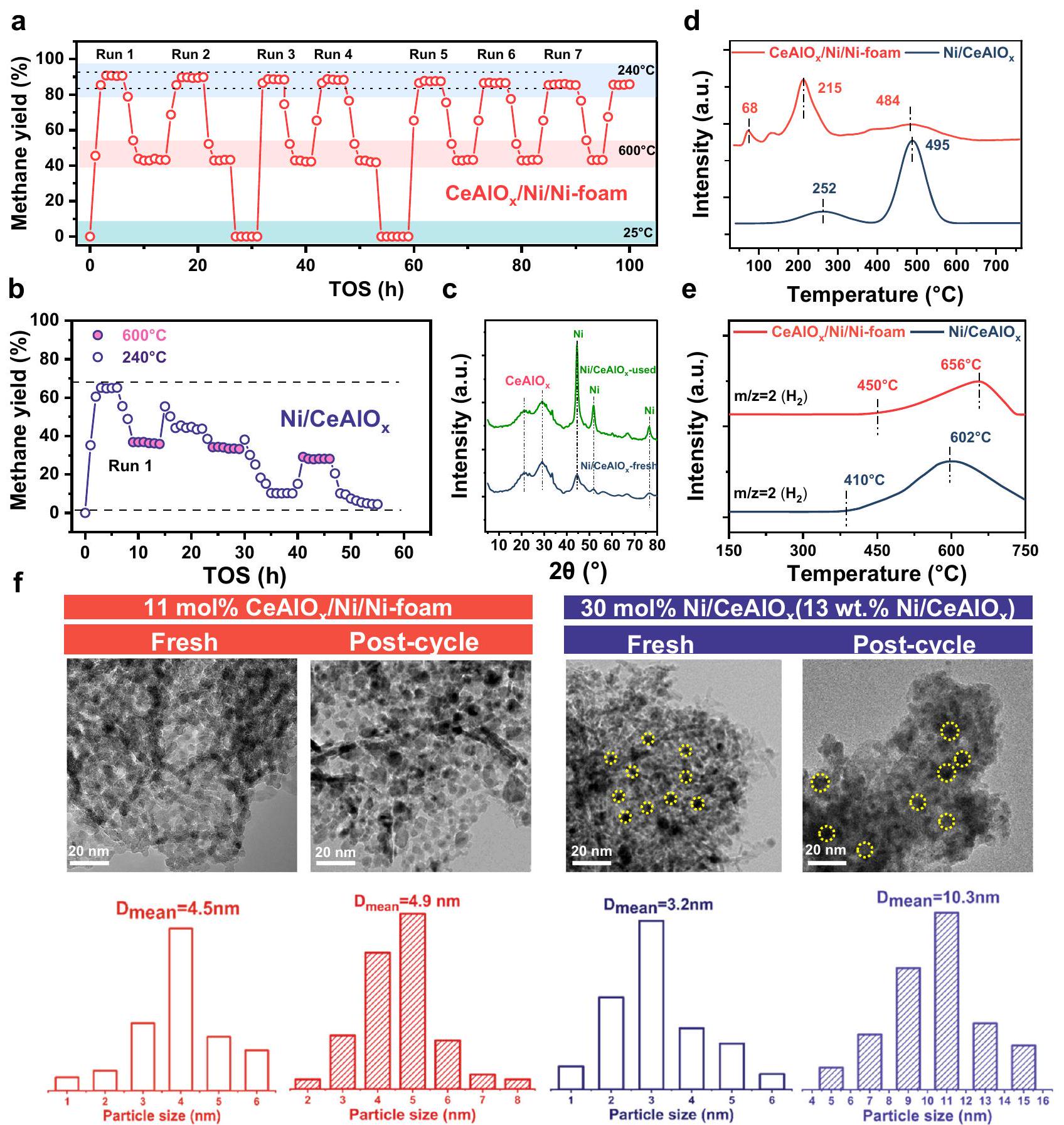 استقرار التفاعل هو على الأرجح أحد أهم المؤشرات لوجود محفز عملي، خاصة بالنسبة لـمحفز الميثنة، الذي يواجه تحديات كبيرة من التلبيد وترسب الكربونلتحقيق مقاومة الصدمة الحرارية لـ-محفز هيكل الرغوة، اختبار تسخين وتبريد متكرر لمدة سبع دورات بين 25 وتم تنفيذها (الشكل 4أ). بعد كل دورة،تحويل وانتقائية-رغوة عنديمكن استعادته (الشكل 4أ). على النقيض، فإن التقليدييظهر تعطيلًا سريعًا بعد دورة تسخين-تبريد واحدة فقط (الشكل 4ب)، وهو ما يرجع على الأرجح إلى تجمع جزيئات النيكل النانوية (انظر أنماط حيود الأشعة السينية للمحفزات الجديدة والمستعملة في الشكل 4ج). تشير هذه الظاهرة إلى أن التفاعل بين الأكسيد وركيزة النيكل يمنع بشكل فعال هجرة أنواع النيكل وبالتالي يمنع التلبيد غير المرغوب فيه.. بالإضافة إلى ذلك، تجربة أكسدة برنامج درجة الحرارة (TPO) للمواد المستهلكةني-فومالمحفزات تؤكد أيضًا أن الكوك تشكل على