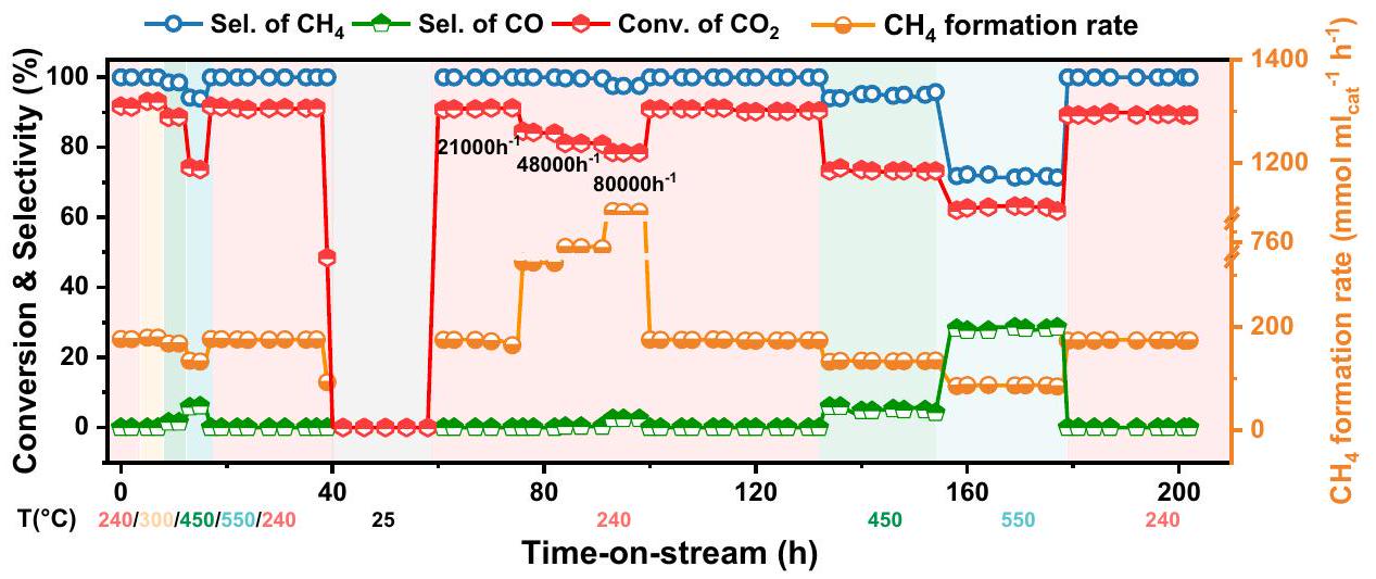 كـالتحويل إلى الميثان هو تفاعل محتمل للتكامل مع إنتاج الهيدروجين غير المستقر والمتقطع من الطاقة المتجددة، يجب أن يكون المحفز المطور للعملية قابلاً للتكيف مع ظروف التشغيل غير المستقرة واحتمالية تكثف البخار.. لذلك، تم تحديد حالة تشغيل غير مستقرة مع تغيرات في درجة الحرارة وسرعة الفضاء لمحاكاة سيناريوهات التطبيق وتقييم الاستقرار لـ-محفز ذو هيكل رغوي (الشكل 6). لا توجد علامات على تعطيل المحفز بعد 200 ساعة من التشغيل، مما يشير إلى إمكانية التطبيق-محفز ذو هيكل رغوي في عمليات تحويل الهيدروجين إلى غاز.