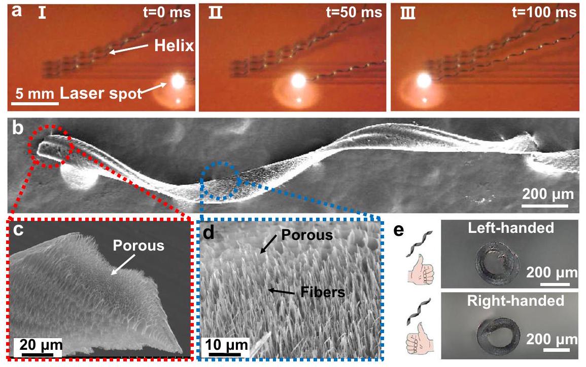 fibers at the sheet’s bottom surface. e Right- and left-handed porous helical LIG sheets processed by selecting different laser scanning directions. These experiments were repeated for more than 10 different batches and yield similar results.