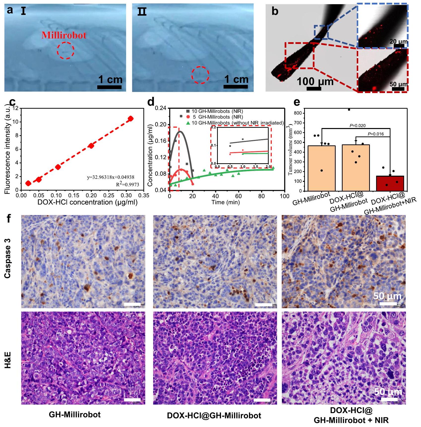 irradiation in 2 mL of deionized water. The curves were fitted using a quadratic Gaussian equation. The fluorescence counting was started 30 s after the initiation of DOX release at time point 0 . Measurements were then taken at intervals of 1 min , 5 min , and subsequently every 5 min thereafter. The inset provides a magnified view of the initial 2-minute period. e Gastric tumor volume in three mice groups. The “DOX-HCl@GH-Millirobot” stand for GH-Millirobot loaded with DOX-HCl, (