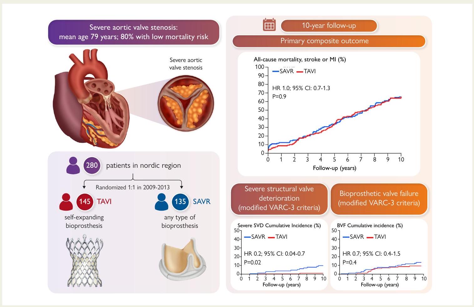Background and Transcatheter aortic valve implantation (TAVI) has become a viable treatment option for patients with severe aortic valve Aims stenosis across a broad range of surgical risk. The Nordic Aortic Valve Intervention (NOTION) trial was the first to randomize patients at lower surgical risk to TAVI or surgical aortic valve replacement (SAVR). The aim of the present study was to report clinical and bioprosthesis outcomes after 10 years.