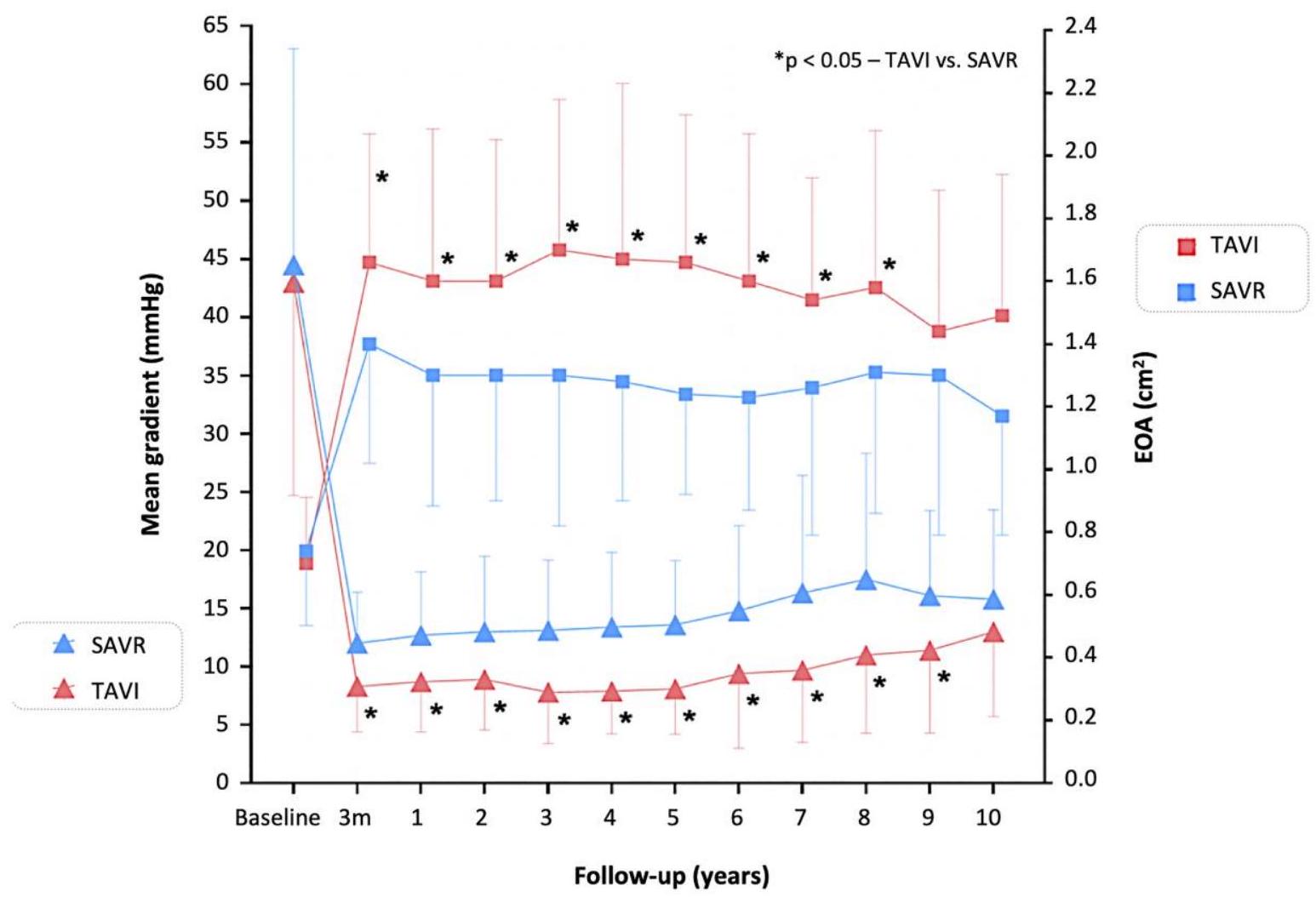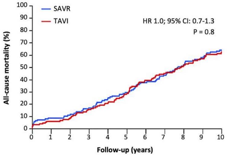 يمكن متابعة المرضى (فقدنا 2 من مرضى TAVI و1 من مرضى SAVR) ومن بين هؤلاء، كان 101 (36.1%) من المرضى على قيد الحياة. كانت البيانات الإيكو قلبية متاحة لـ 82 (81.2%) من المرضى الذين وصلوا إلى 10 سنوات. البيانات الإيكو المفقودة لمدة 10 سنوات لـ 12 من 52 (23.1%) من مرضى TAVI و7 من 49 (14.2%) من مرضى SAVR. لمزيد من التفاصيل الإجرائية، انظر البيانات التكميلية على الإنترنت، الجداول S1 وS2 وS4.