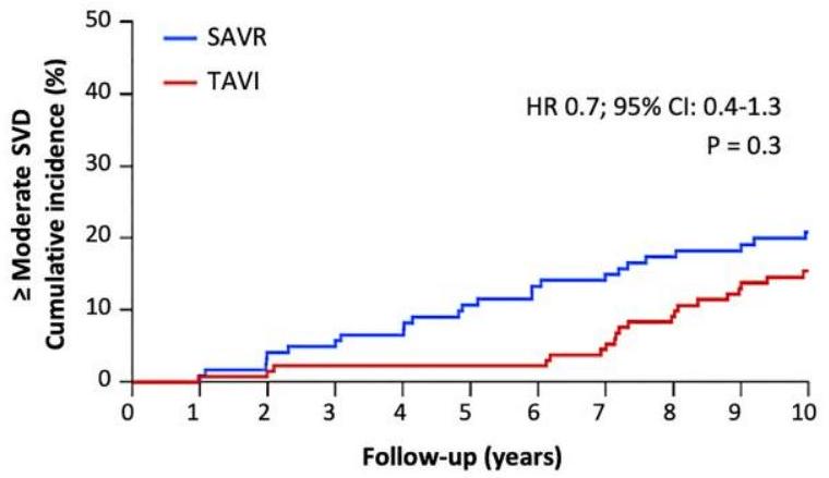 ‘haemodynamic’ VARC-3 criteria was lower after TAVR compared with SAVR after 5 years (