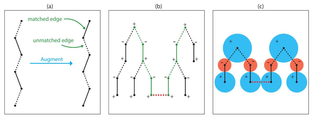 الشكل 2: (أ) تعزيز مسار التعزيز. تصبح الحواف المتطابقة غير متطابقة، وتصبح الحواف غير المتطابقة متطابقة. (ب) أمثلة على شجرتين متناوبتين في خوارزمية الزهرة للعثور على تطابق أقصى. تحتوي كل شجرة على عقدة واحدة غير متطابقة. أصبحت الشجرتان متصلتين عبر الحافة الحمراء المتقطعة. المسار بين جذور الشجرتين، من خلال الحواف الخضراء والحافة الحمراء، هو مسار تعزيز. (ج) مثال على شجرتين متناوبتين في خوارزمية الزهرة للعثور على تطابق مثالي بأقل وزن. تحتوي كل عقدةالآن لديها متغير مزدوجالذي، عندماإيجابي، يمكننا تفسيره على أنه نصف قطر منطقة مركزها العقدة. حافة جديدة ( ) مع الوزن يمكن استكشافه فقط بواسطة الشجرة المتناوبة إذا كانت مشدودة، مما يعني أن المتغيرات المزدوجة و يرضي.