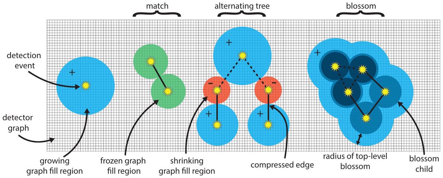 In Table 1 we summarise how some of the concepts in the traditional blossom algorithm translate into concepts in sparse blossom. If the traditional blossom algorithm is run on the path graph using a multiple tree approach (and with all dual variables initialised to zero at the start), then a valid state of blossom at a particular stage corresponds to a valid state of sparse blossom for the same problem at the appropriate point in the timeline. The dual variables in blossom define the region radiuses in sparse blossom (and these radiuses can be used to construct the corresponding exploratory regions). Likewise the edges in the alternating trees, blossom cycles and matches in traditional blossom can all be translated into compressed edges in the corresponding entities in sparse blossom. We note, however, that when multiple alternating tree events happen at the same time in sparse blossom, any ordering for the processing of these events is a valid choice. So just because we can translate a valid state of one algorithm to that of the other, does not imply that two implementations of the algorithms (or the same algorithm) will have the same sequence of alternating tree manipuations (indeed it is unlikely that they will). This correspondence between sparse blossom run on the detector graph and traditional blossom run on a path graph, and the correctness of blossom itself for finding a MWPM, is one way understanding why sparse blossom correctly finds a MWEM in the detector graph.