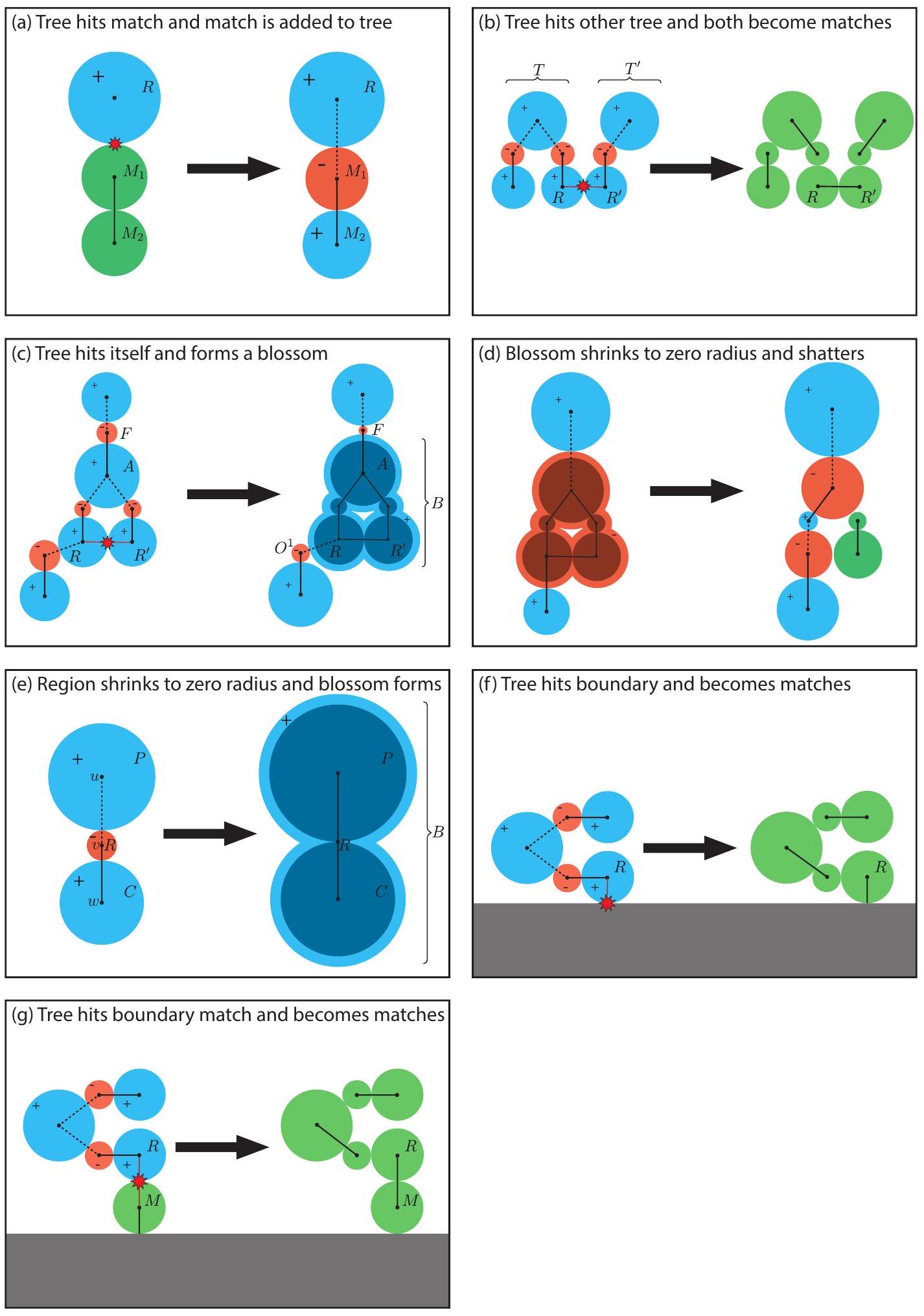 As time passes, each growing region explores the graph and its radius increases by and each shrinking region shrinks in the graph and its radius decreases by . Eventually at a collision or implosion occurs (one of the matcher events in Figure 4), which must be handled by the matcher.