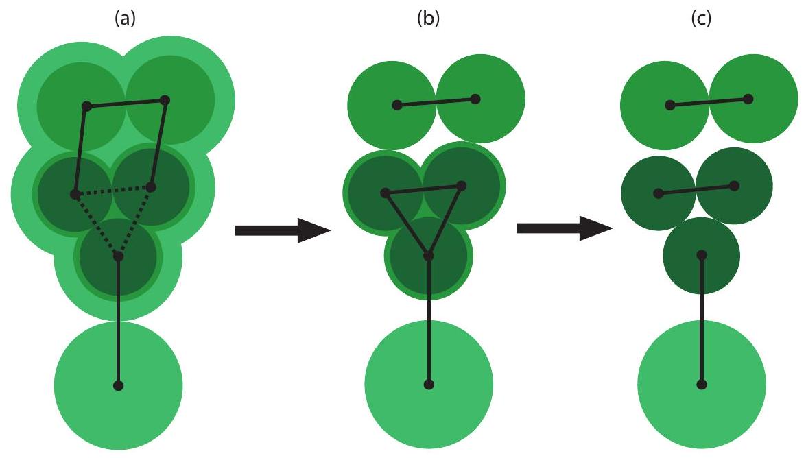 في الشكل 2(c) نقدم مثالاً مع شجرتين متناوبتين، ونصور متغيراً مزدوجاً كونه نصف قطر منطقة دائرية مركزة على عقدته. من خلال تصور المتغيرات المزدوجة بهذه الطريقة، يكون الحافة بين عقدتين تافهتين مشدودة إذا كانت المناطق عند نقاط نهايتها تلامس. في هذا المثال، نقوم بتحديث المتغيرات المزدوجة (الأشعة) حتى تلامس الشجرتان المتناوبتان، في هذه النقطة تصبح الحافة التي تربط الشجرتين مشدودة، ويمكننا زيادة المسار بين جذور الشجرتين. لاحظ أنه يمكننا فقط تصور المتغيرات المزدوجة كأشعة مناطق بهذه الطريقة عندما تكون غير سالبة. بينما تكون المتغيرات المزدوجة للزهور دائماً غير سالبة (كما يفرضه المعادلة 5c)، يمكن أن تصبح المتغيرات المزدوجة للعقد العادية سالبة بشكل عام. ومع ذلك، عند تشغيل خوارزمية الزهرة في رسم بياني على شكل مسار، فإن المتغير الثنائي لكل عقدة منتظمة يكون دائمًا غير سالب، وذلك بسبب هيكل الرسم البياني. يمكن فهم ذلك على النحو التالي. اعتبر أي عقدة داخلية منتظمة.هذا ليس زهرة، التي يجب أن تحتوي بالضرورة على عقدة خارجية واحدة فقط.في شجرتها المتناوبة (مطابقتها)، بالإضافة إلى عقدتها الخارجية الأم الواحدةتذكر أن رسم المسار هو رسم بياني كامل حيث الوزن لكل حافة ( ) هو طول أقصر مسار بين العقد و في بعض الرسوم البيانية الأخرى (على سبيل المثال، في حالتنا دائمًا رسم بياني للكاشف). لذلك هناك أيضًا حافة ( ) في رسم المسار مع الوزن ، حيث نعلم أن هناك على الأقل مسار واحد منإلىبطول، الذي يتوافق مع اتحاد أقصر مسار منإلىوأقصر طريق منإلى. لذلك، لا يمكننا أن نملكدون أن يكونالذي سينتهك المعادلة 5 ب. بشكل أكثر تحديدًا، إذاثم نعلم أن الحافةيجب أن تكون محكمة، مما يعني أنه يمكننا تشكيل زهرة جديدة من دورة الزهور (يمكن أن تصبح هذه الزهرة عقدة خارجية في الشجرة المتناوبة (التي قد تكون الآن تافهة).