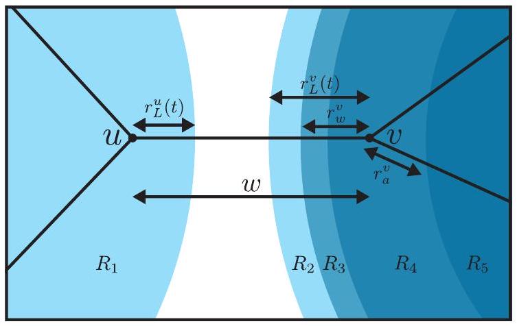 The tracker is responsible for ensuring flooder events occur in the correct order. A simple approach one could take to implement the tracker would just be to place every flooder event in a priority queue. However, many of the potential flooder events are chaff. For example, when a region is growing, a flooder event would be added to the queue for each of its neighboring edges. We say an edge ( ) is a neighbor of a region if is in and is not (or vice versa). Along each neighboring edge, there will be an event either corresponding to the region growing into an empty node, or colliding with another region or boundary. However, if the region becomes frozen or shrinking, then all of these remaining events will be invalidated.