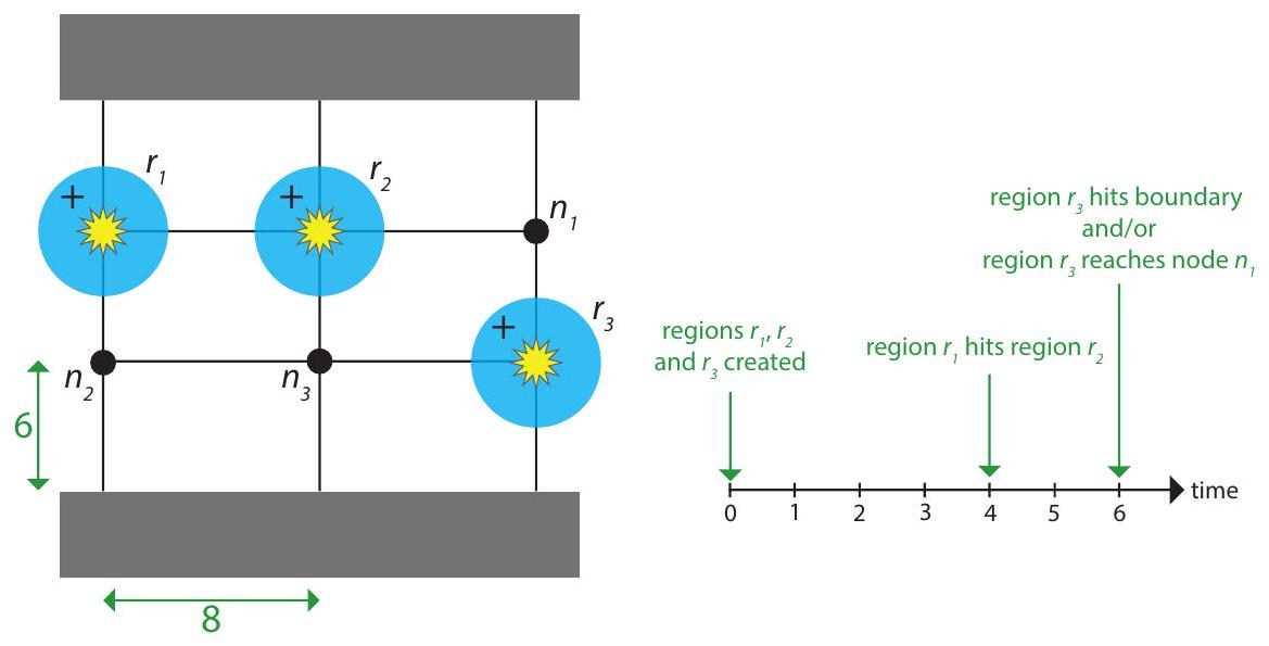 Figure 7: An example of some flooder events in a detector graph with three growing regions.