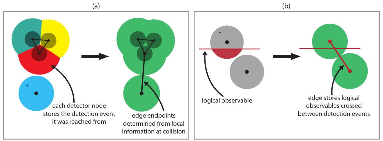 Figure 8: (a) As a region expands, each detector node it contains stores the detection event it was reached from (visualised by the Voronoi-style colouring of the blossom on the left). When a collision occurs, this allows the endpoints of the corresponding compressed edge (collision edge) to be determined from local information at the point of collision. (b) Each detector node also stores (as a 64-bit bitmask) the observables that were crossed to reach it from the detection event it was reached from. This allows the observables bitmask of the compressed edge to be recovered efficiently, also from local information at the point of collision.