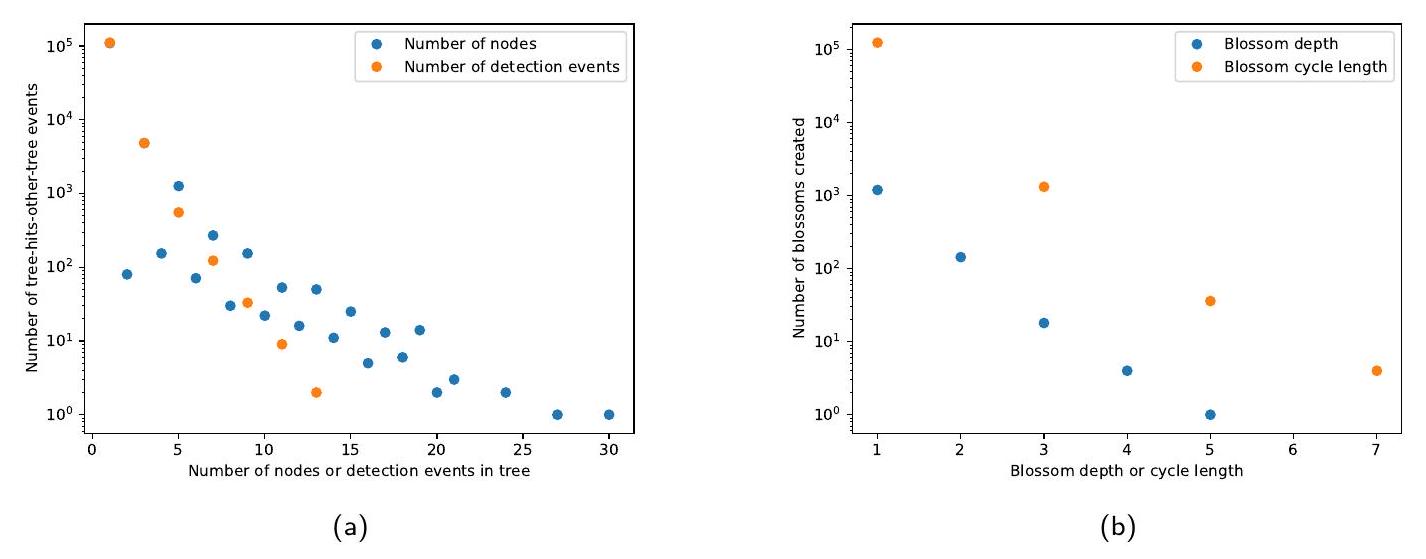 Figure 9: Distribution of alternating tree and blossom sizes observed in sparse blossom when decoding 1000 shots of distance- 11 surface code circuits with circuit-level noise. (a) A histogram of the size of alternating trees observed in events where a tree hits another tree, in terms of both the number of detection events and detector nodes contained in each tree. (b) A histogram of the size of blossoms formed, in terms of both the length of each blossom’s blossom cycle, as well as its recursive depth. A blossom depth or cycle of size one is a trivial blossom (a graph fill region without blossom children).