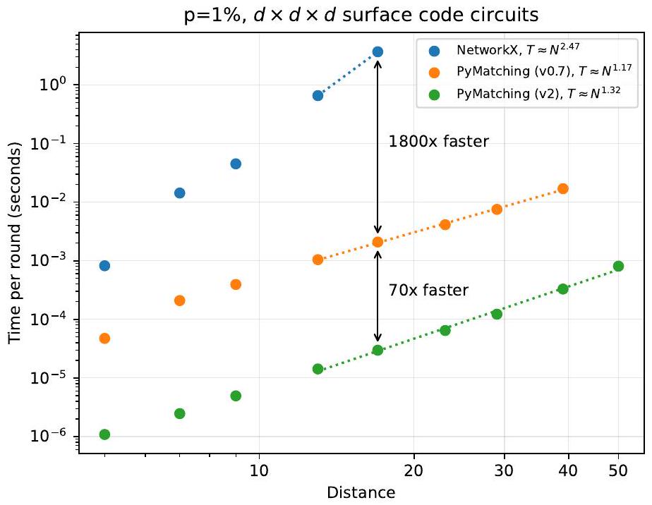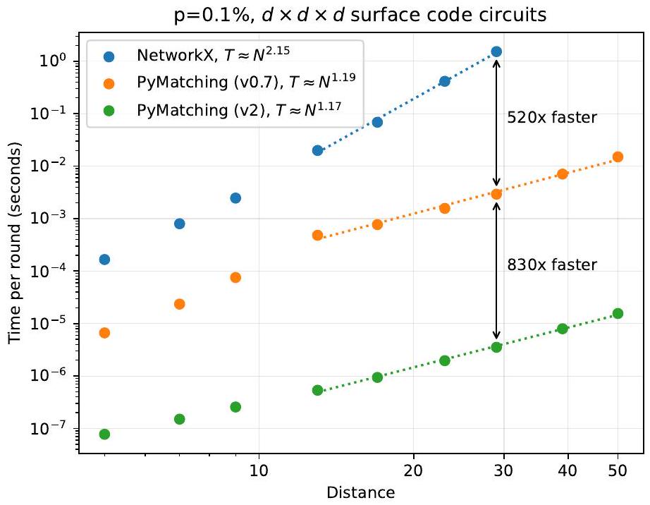 At low physical error rates (e.g. Figure 10), the roughly linear scaling of PyMatching v2 is a quadratic improvement over the empirical scaling of an implementation that constructs the path
