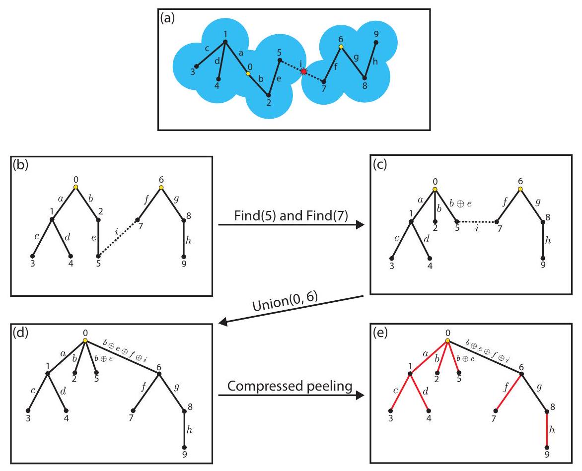 Figure 15: Compressed tracking in Union-Find. (a) Two clusters collide. Each node in the cluster tree denotes a detection event, and each edge is a compressed edge representing a path between the two detection events in the detector graph (not necessarily a shortest path). Each edge is labelled with a letter denoting the bitmask of the observables crossed along the path it represents. This differs from traditional Union-Find implementations, where every detector node in a cluster is a node in the cluster tree. When two clusters collide, we store a compressed edge for the path between detection events along which the collision occurred (the collision edge). (b) The two cluster trees, along with the collision edge (dashed line). (c) After finding the source detection events ( 5 and 7) involved in the collision, we call Find(5) and Find(7). When using path compression (which here connects node 5 to the root node), we ensure the observable bitmask is kept up-to-date by taking the sum (modulo 2) of bitmasks along the path to the root node. (d) Union adds the smaller cluster as a subtree of the root node of the larger cluster (node 6 becomes a child of node 0 ). We store the observable bitmask along edge ( 0,6 ), by taking the sum (modulo 2 ) of the observable bitmasks on edges ( 0,5 ), ( 6,7 ) and the collision edge (5, 7). (e) The combined cluster now has even parity. We use compressed peeling to highlight a set of edges (shown in red) such that each node is incident to an odd number of edges. We take the sum (modulo 2) of the observable bitmasks on these highlighted edges to find the predicted logical observable.