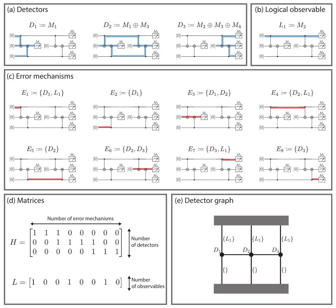 نحن نعرف نموذج الخطأ المستقل بأنه مجموعة منآليات خطأ مستقلة، حيث آلية الخطأيحدث باحتمالية (حيث هو متجه من الأولويات)، ويقوم بتغيير مجموعة من الكواشف والملاحظات. يمكن استخدام نموذج خطأ مستقل لتمثيل الضوضاء المسببة للانحلال على مستوى الدائرة بدقة، وهو تقريبي جيد للعديد من نماذج الخطأ التي يتم النظر فيها عادةً [Cha+20؛ Gid20]. يمكن أن يكون من المفيد وصف نموذج خطأ في دائرة تصحيح الأخطاء باستخدام مصفوفتين للتحقق من التماثل الثنائي: مصفوفة تحقق الكاشف ومصفوفة منطقية قابلة للملاحظة. نحن نحددإذا كان الكاشفيتم قلبه بواسطة آلية الخطأ، و بخلاف ذلك. بالمثل، نحن نحددإذا كان قابلاً للملاحظة المنطقيةيتم قلبه بواسطة آلية الخطأ، و بخلاف ذلك. من خلال وصف نموذج الخطأ بهذه الطريقة، يتم تعريف كل آلية خطأ من خلال الكواشف والملاحظات التي تقوم بتغييرها، بدلاً من نوع باولي وموقعها في الدائرة. من دائرة مثبتة ونموذج ضوضاء باولي، يمكننا بناء و بكفاءة من خلال نشر أخطاء باولي عبر الدائرة لرؤية أي الكواشف والملاحظات التي تقوم بتغييرها. كل سابقثم يتم حسابه عن طريق جمع احتمالات جميع أخطاء باولي التي تقلب نفس مجموعة الكواشف أو الملاحظات (أو بشكل أكثر دقة، فإن هذه الآليات الخطأ المعادلة مستقلة، ونحسب احتمال حدوث عدد فردي). هذا هو بالأساس ما تفعله أدوات تحليل الأخطاء في Stim، حيث يقوم نموذج خطأ الكاشف (الذي يتم إنشاؤه تلقائيًا من دائرة Stim) بالتقاط المعلومات المحتواة في و [Gid21].