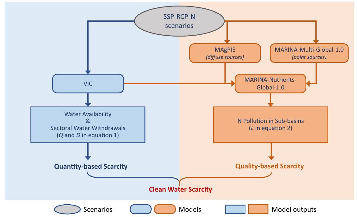 أمن المياه في خطر اليوم. بينما تؤثر التغيرات المناخية على توفر المياه، أدت التحضر والأنشطة الزراعية إلى زيادة الطلب على المياه بالإضافة إلى التلوث، مما يحد من استخدام المياه الآمنة. قمنا بإجراء تقييم عالمي لندرة المياه النظيفة المستقبلية لعام 2050 من خلال إضافة جانب تلوث المياه إلى التقييمات التقليدية لندرة المياه الناتجة عن الكمية. تم ذلك من أجل