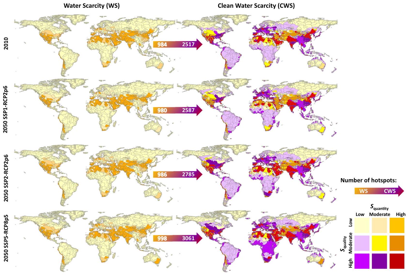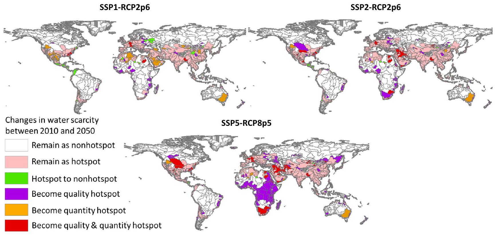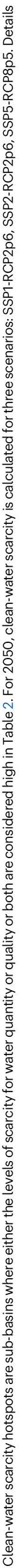 حيث تعتبر مستويات الندرة لمياه الكمية أو الجودة أو كليهما مرتفعة كما هو موضح في الجدول 2. بالنسبة لعام 2050، تم حساب ندرة المياه النظيفة لثلاثة سيناريوهات: SSP1-RCP2p6، SSP2-RCP2p6، SSP5-RCP8p5. تفاصيل السيناريوهات بناءً على المسارات الاقتصادية المشتركة (SSPs) ومسارات التركيز التمثيلية (RCPs) متاحة في الجداول S9-S11 في المعلومات الداعمة.
