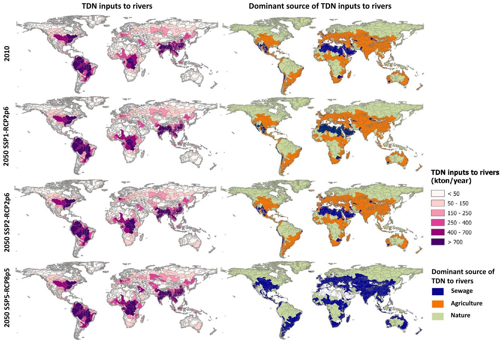 تحسنت إلى مستويات عالية، حيث إن الإنتاج الغذائي العالي في الصين والهند وأوروبا وأمريكا الشمالية (مثل نهر المسيسيبي) المدفوع بطلب الغذاء لا يزال يؤدي إلى فائض عالٍ من النيتروجين في الزراعة (الشكل التوضيحي التكميلي S20 في الملحق). في سيناريو SSP5، يتم دفع التلوث عالميًا بشكل رئيسي بواسطة مياه الصرف كما هو موضح أعلاه بسبب التحضر العالمي وعدم كفاية تطوير معالجة مياه الصرف. لا يزال ترسيب النيتروجين في الغلاف الجوي وثباته على الأراضي الطبيعية المصدر الرئيسي لإدخالات TDN إلى الأنهار في أمريكا الجنوبية ووسط أفريقيا في المستقبل، بينما يصبح فائض النيتروجين الزراعي أكثر أهمية بشكل متزايد في سيناريو SSP5 (الشكل التوضيحي التكميلي S20 في الملحق).