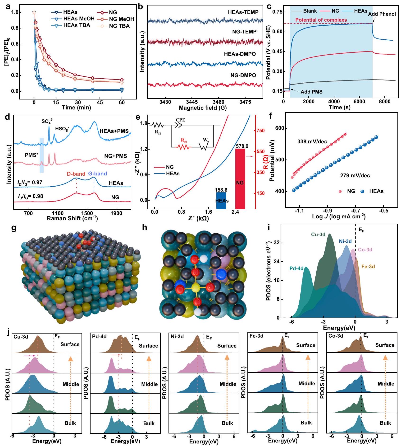 the liquid solution. e Nyquist plots and fitting calculations of internal resistance for HEAs and NG. Tafel slope on the HEAs-GCE and NG-GCE electrodes in phenol solutions. The side view of the structural configuration of PMS on HEAs. The top view of the structural configuration of PMS on HEAs. i The PDOSs of the HEAs. j The site-dependent PDOSs of , and Co in HEAs.