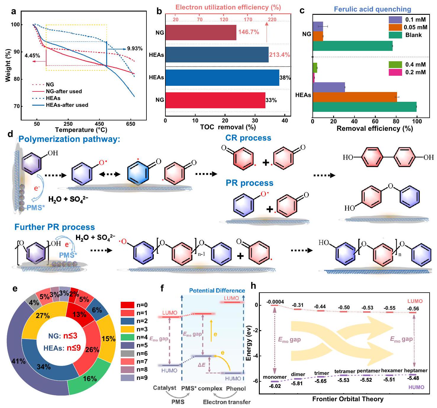 علاوة على ذلك، عند استنفاد مصدر الإلكترون (PMS)، يمكن أن يؤدي الربط غير الكافي للجذور البوليمرية إلى إنهاء تفاعلات البلمرة. هذه النتيجة تتماشى مع نتائج تجربة TGA التي أظهرت أن HEAs تتمتع بكفاءة أعلى في تحويل الملوثات إلى بوليمر. في الشكل 4e، أظهر تحليل توزيع درجة البلمرة على أسطح NG وHEAs أن التترايمرات ( ) و خماسيات ( ) تُلاحظ بشكل رئيسي على سطح NG، بينما معظم السداسيات ( ) إلى نونامرات ( ) موجودة على سطح HEAs. بالمقابل، يتم إذابة المنتجات ذات درجة البوليمرة المنخفضة في الطور الحلولي. وبالتالي، فإن الجهد الكهروكيميائي الأعلى لـ HEAs-PMS* وقدرة نقل الإلكترون الأسرع يمكن أن تحفيز التوليد السريع وتراكم الجذور الحرة الفينوكسي، مما يعزز حركية تحويل الفينول إلى بوليمر لإنتاج منتجات بوليفينول أكبر.