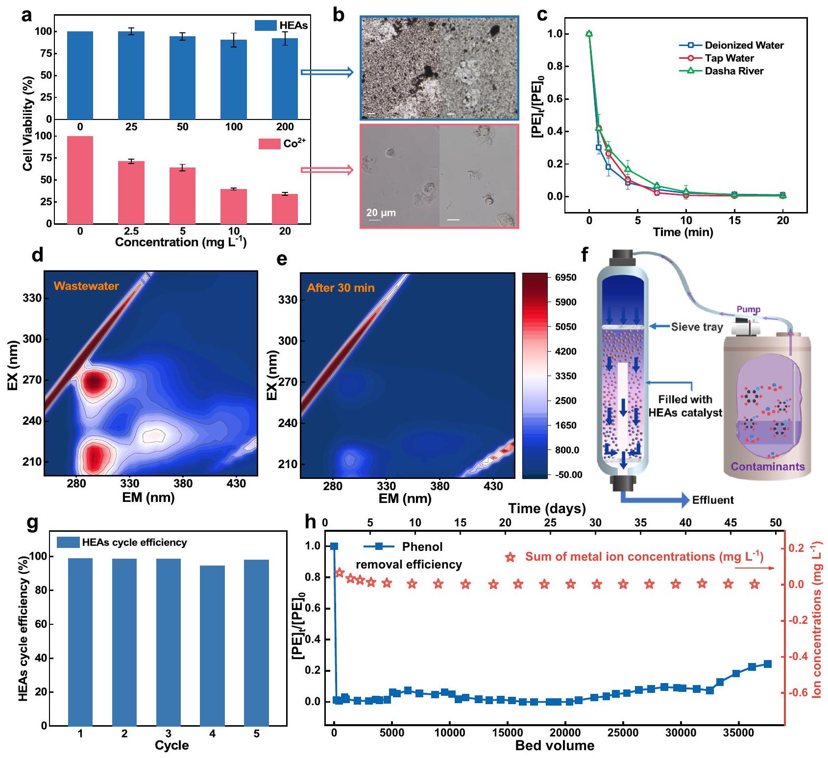 b Cells in the culture medium were observed under a microscope. c Treatment of phenol in real water matrices. d, e EEM spectra of collected coal chemical industry wastewater before (d) and after treatment (e) by HEAs-PMS system. f Schematic of