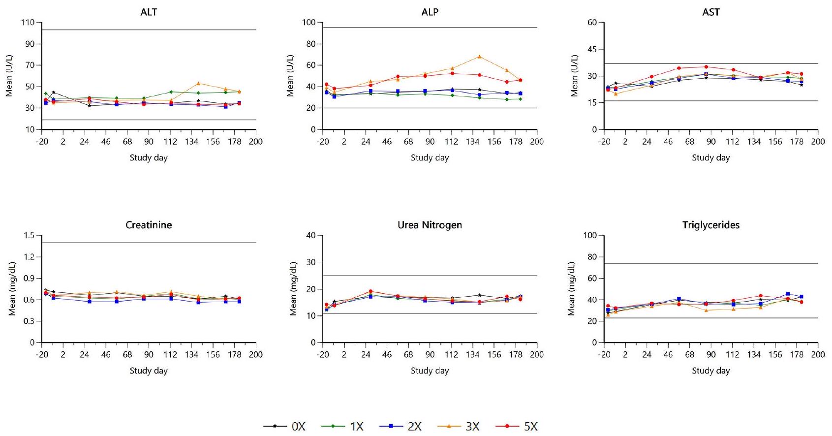 There were minimal increases in fibrinogen at elevated doses, however, the clinical chemistry profile indicated individually elevated total protein and globulin levels, accompanied by reduced albumin levels and albumin/ globulin ratios. C-reactive protein (CRP) levels were also higher. Notably, all dogs exhibiting these elevations also presented with visible skin disease. These findings were typical of an acute phase response and were temporally associated with microscopic inflammatory changes in the skin, presumed to be secondary to interdigital furunculosis. No further relevant changes were observed in clinical pathology parameters.