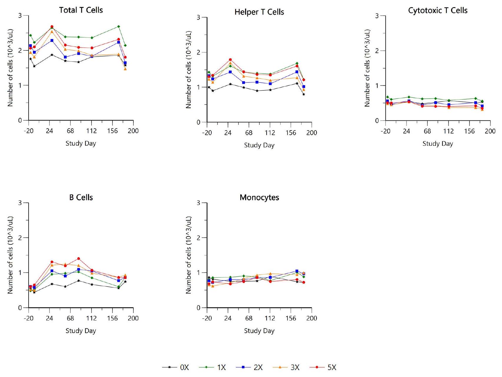 تم جمع عينات الدم الكامل أيضًا من الوريد الوداجي لتقييم مجموعات الكريات البيضاء والأنماط الظاهرية في أيام الدراسة -16 و -8 ، وفي أيام الدراسة