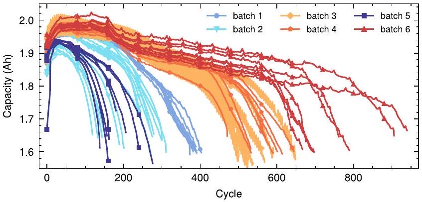 Fig. 2 | The degradation trajectories of the XJTU battery dataset. There are 6 batches ( 55 batteries) in total, all batches contain 8 batteries except batch 2 which contains 15 batteries. The charge/discharge protocols are different among batches. See Supplementary Note 1 for more details.