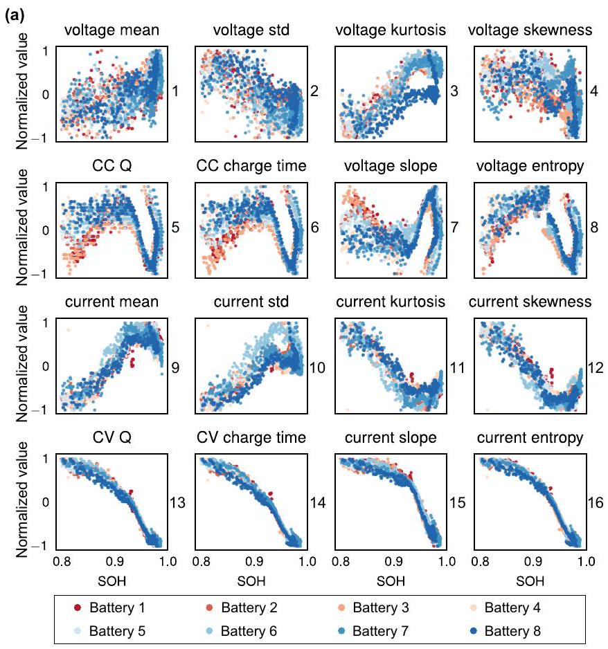 a Features of 8 batteries from the XJTU dataset batch 1. The -axis of each subfigure is SOH , and the -axis is the normalized value of the corresponding feature. The number on the right side of each subfigure represents the feature number.