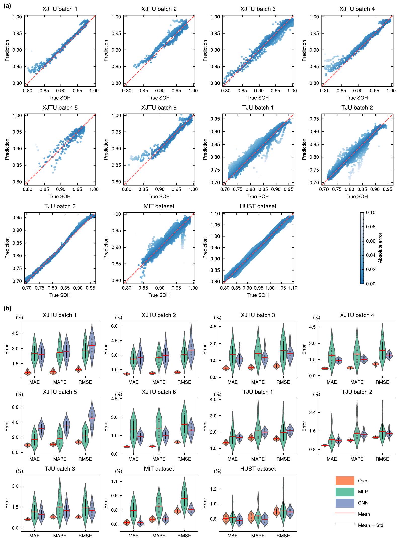 parameter amounts are used as comparison methods. The details of MLP and CNN can be found in Supplementary Note 3. For each dataset, we divide the training batteries, validation batteries, and test batteries approximately in a ratio of . The number of test batteries in each dataset can be found in Table S2. To ensure fairness, the numbers of test batteries are evenly distributed throughout the dataset, as shown in Tables S3-S6. The results of the 3 models on the 4 datasets are shown in Table 2 (only the average test errors on each dataset are given, and the test results of each battery can be viewed in Tables S3-S6. It can be seen from the table that our method has the smallest estimation errors in most cases. The average MAPE of the proposed PINN on the 4 datasets is , and , while that of MLP is , and . It is worth noting that they have the same number of parameters and model structure during inference.